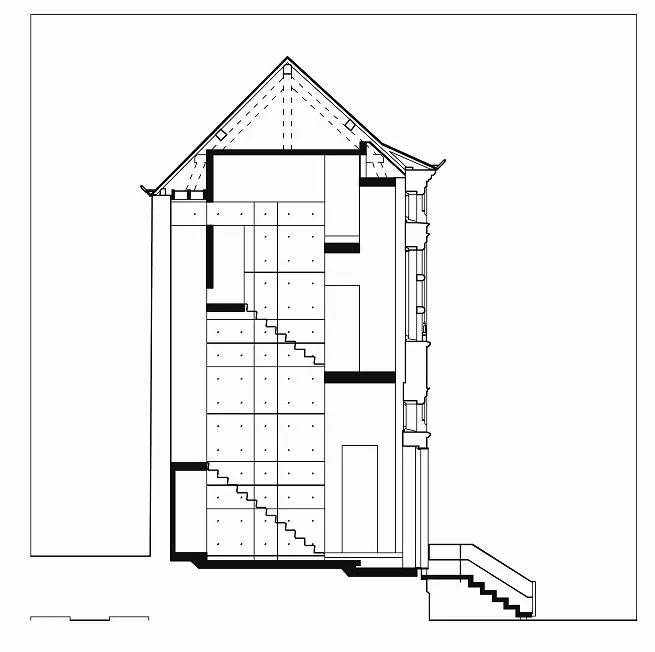 Les parties manquantes sont traitées de manière contemporaine : les châssis sont placés en retrait des encadrements et la porte d'entrée est encastrée dans un pourtour métallique qui découpe les parties anciennes.