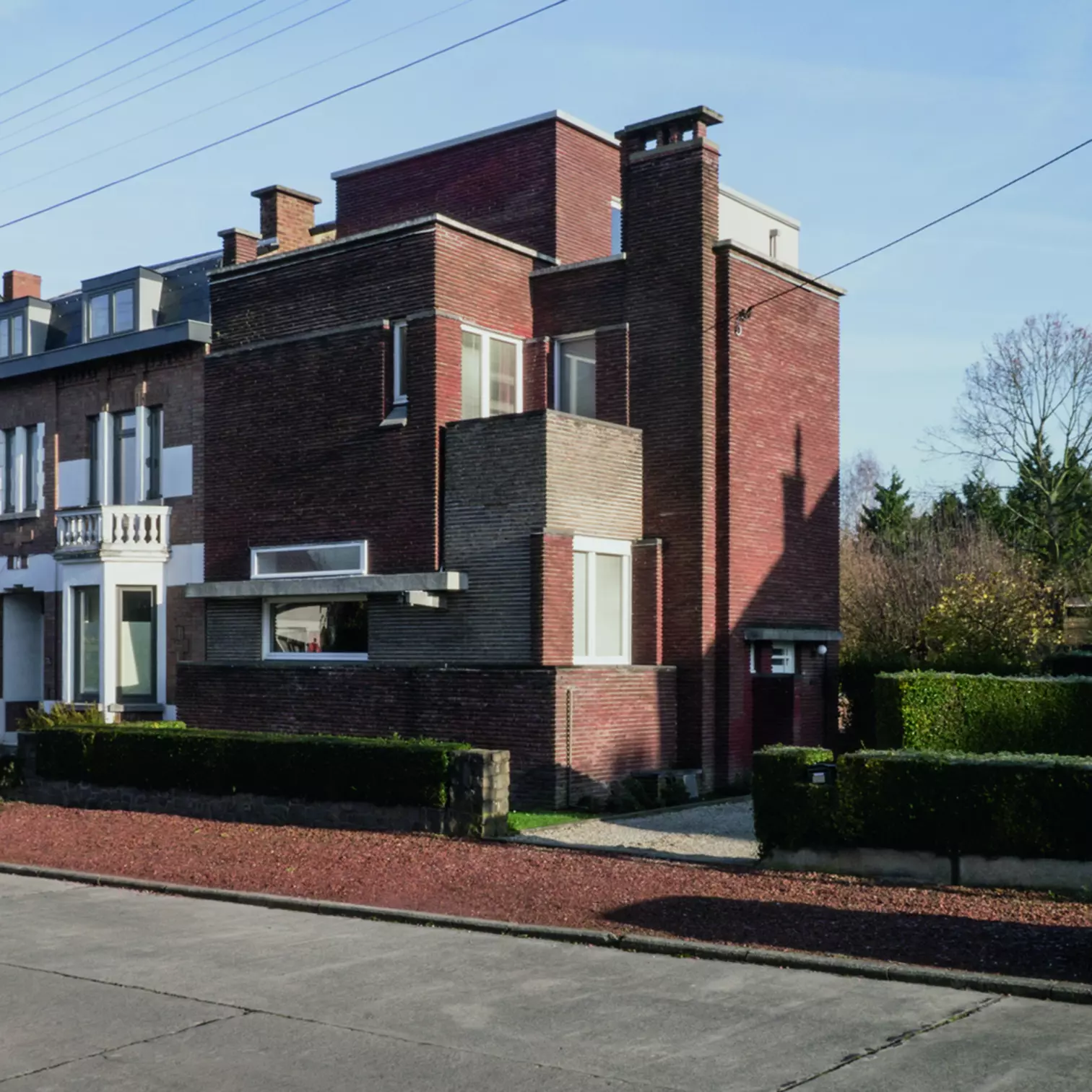 En about d'une rangée de maisons, l'habitation d'une belle valeur expressive s'intègre au contexte de la rue. Ses trois façades dégagent de belles vues sur le jardin bordé de haies. La volumétrie cubique et austère est éclatée et traitée en dégradé vers le haut. La composition des façades est géométrique, marquée par le jeu de différents plans de briques foncées et claires, et précisée de lignes en creux, à redents, épaisses ou fines. Les joints horizontaux en retrait sont bien marqués et structurent les surfaces.