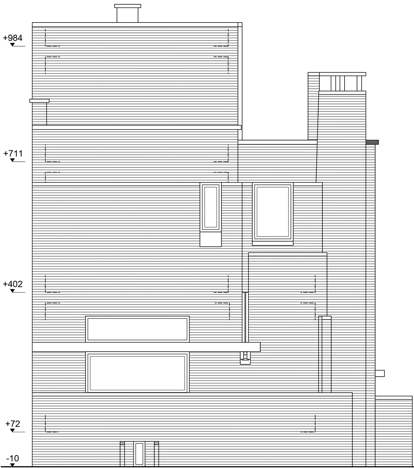 L'entrée, la circulation verticale et le bureau sont rappliqués vers le sud, créant ainsi la richesse volumétrique ; la fonction crée la forme. L'entrée latérale est privatisée par un muret. L'élément de cheminée accentue l'élancement, et l'intéressante gargouille porte la signature de l'architecte.