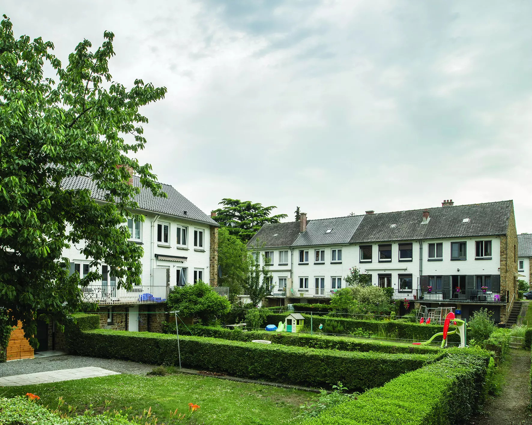 Une cité de logements sociaux est implantée sur une ancienne propriété châtelaine en bord de Meuse. L'implantation souple et aérée des logements est organisée autour d'un parc arboré comptant de nombreux équipements publics : terrains de sport, aires de jeux, espaces communautaires dans le château et restaurant. Les groupes de maisons et les immeubles à appartements de trois ou quatre niveaux sont précédés de jardinets dans un environnement verdurisé. L'expression architecturale de volumes purs est accentuée par les pignons massifs en pierre. Les façades de briques peintes en blanc sur un soubassement en pierre sont couvertes de toitures en tuiles sombres avec des corniches débordantes. Cette unité de conception d'un modernisme classique illustre l'évolution des cités-jardins des années 1950.