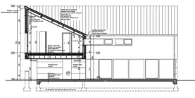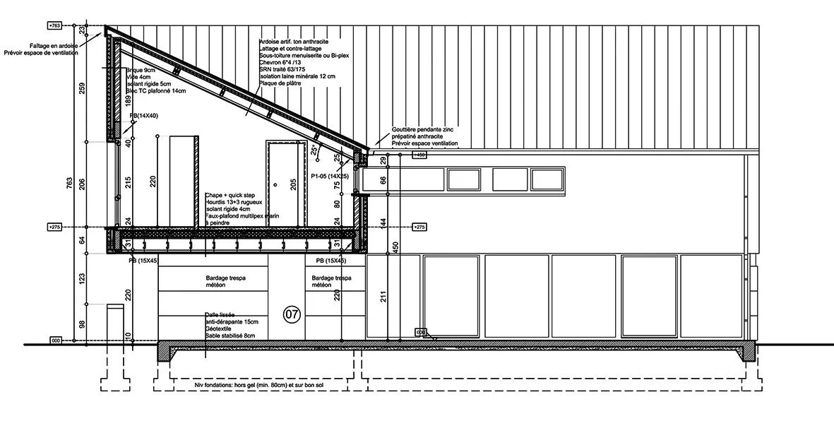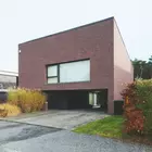 L'habitation s'implante en L sur la limite latérale droite d'un terrain orienté au sud. Elle se démarque du tissu résidentiel existant tant dans l'emploi de matériaux distincts – brique Desaegher Goya, Trespa pour les murs, tuile plate anthracite en terre cuite pour la toiture et aluminium noir pour les menuiseries – que par sa conception spatiale. L'élévation à rue rompt avec le contexte bâti par un jeu de toiture à versant unique, offrant une grande hauteur intérieure appropriable.