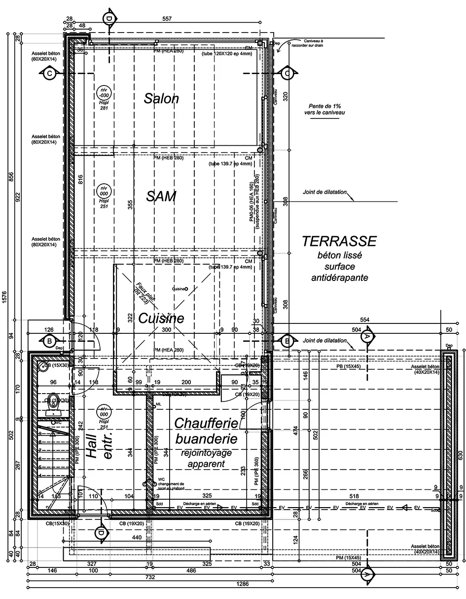 L'agencement spécifique des volumes permet de créer une terrasse protégée au sud. Au rez-de-chaussée, un carport s'intègre à la pinède du fond de la parcelle. L'architecte obtient ainsi un astucieux compromis entre perméabilité, intimité et accessibilité.