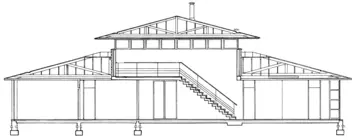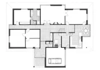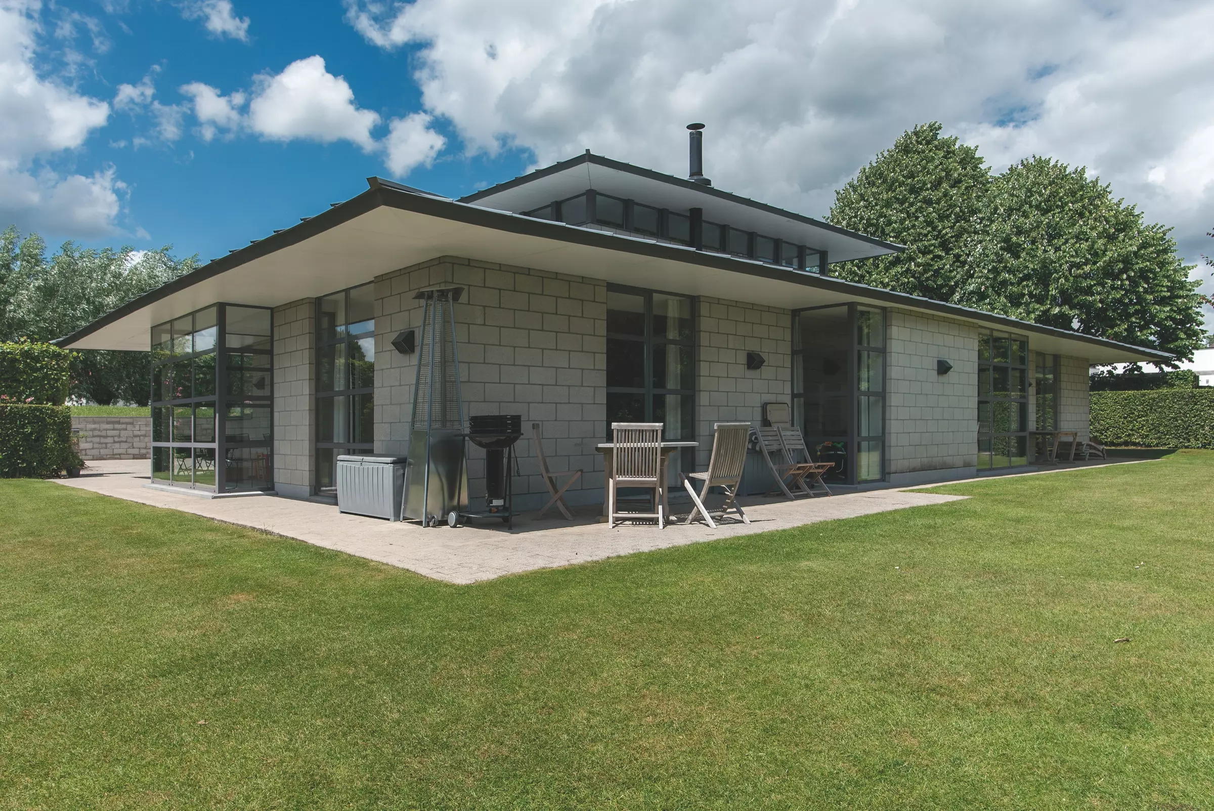 À son arrivée, le visiteur ne découvre que la silhouette des toitures de l'habitation par-dessus un talus bordé d'arbres. Celles-ci intègrent parfaitement la construction à son environnement naturel et évoquent, par leur forte horizontalité, les Prairie Houses de Wright. Des fenêtres en bandeau encouragent la relation avec l'extérieur, les toits débordants de faible inclinaison s'organisent autour d'un volume central. La couverture de l'étage, posée sur une ossature métallique, se détache clairement des baies vitrées sous-jacentes. Au rez-de-chaussée, un couloir traversant sépare le cabinet médical de la partie privée, en relation avec les jardins. À l'étage, les chambres s'organisent autour d'un espace partagé. Les matériaux monochromes participent à l'harmonie des volumes : blocs de béton gris, couvertures en zinc prépatiné, châssis en aluminium gris.