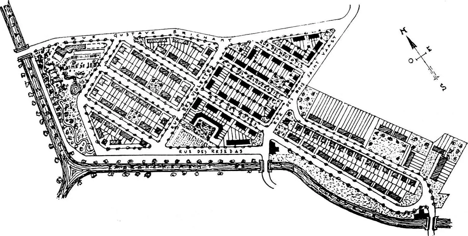 Les logements sont réunis par groupe de deux ou quatre habitations unifamiliales, à un ou deux niveaux avec toitures à quatre pans, en recul par rapport à la voirie, parallèles à celle-ci et entourés de vastes jardins. Dans la première phase, l'architecte Pierre Vinck combine la brique jaune et la tuile de terre cuite, dans une écriture sobre et rationnelle (encadrements de baies à ressauts, linteaux saillants continus).