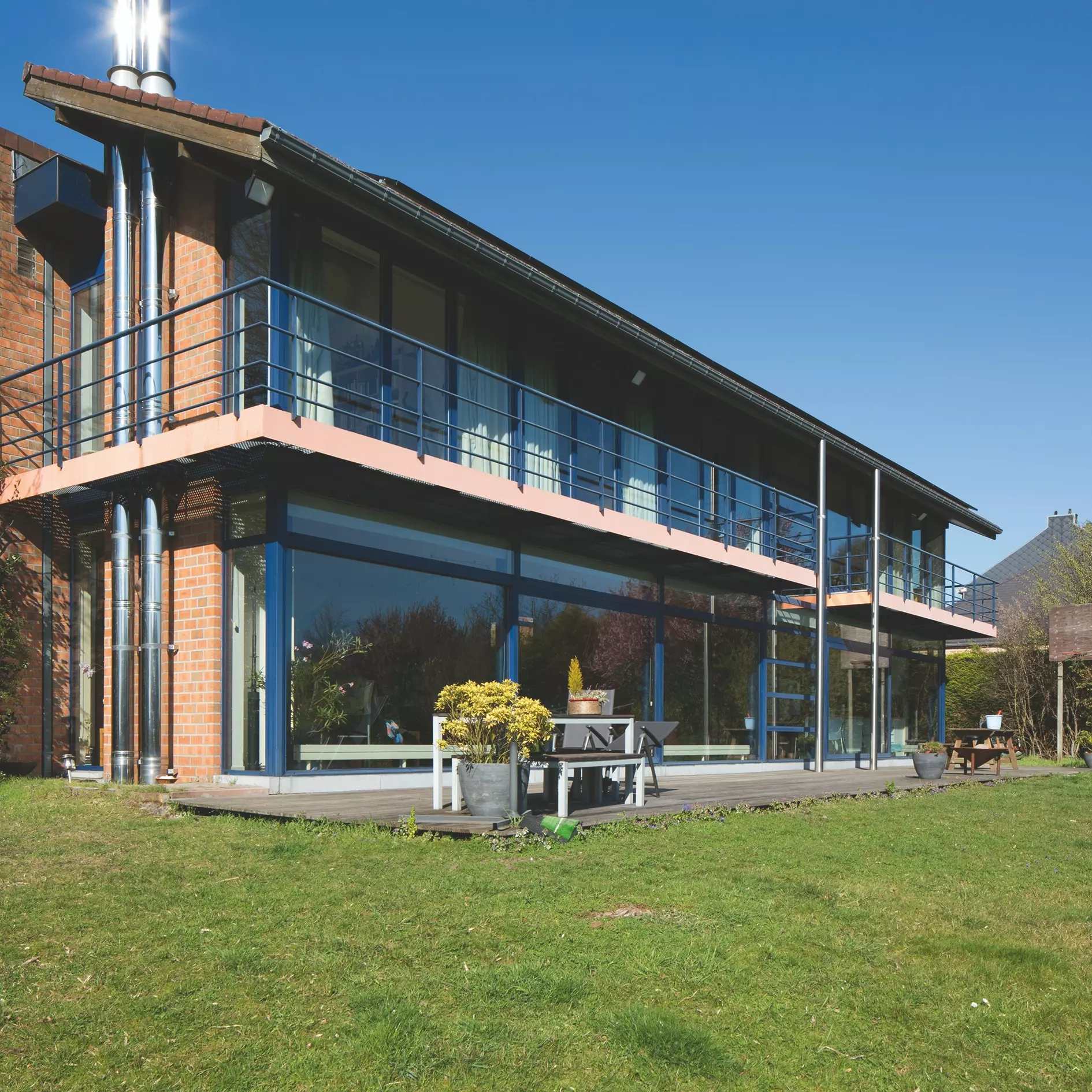 Ancrée sur le versant sud de la vallée de la Haine, l'habitation, orientée plein sud à l'arrière, se caractérise par l'inscription de sa volumétrie simple dans la typologie environnante.
