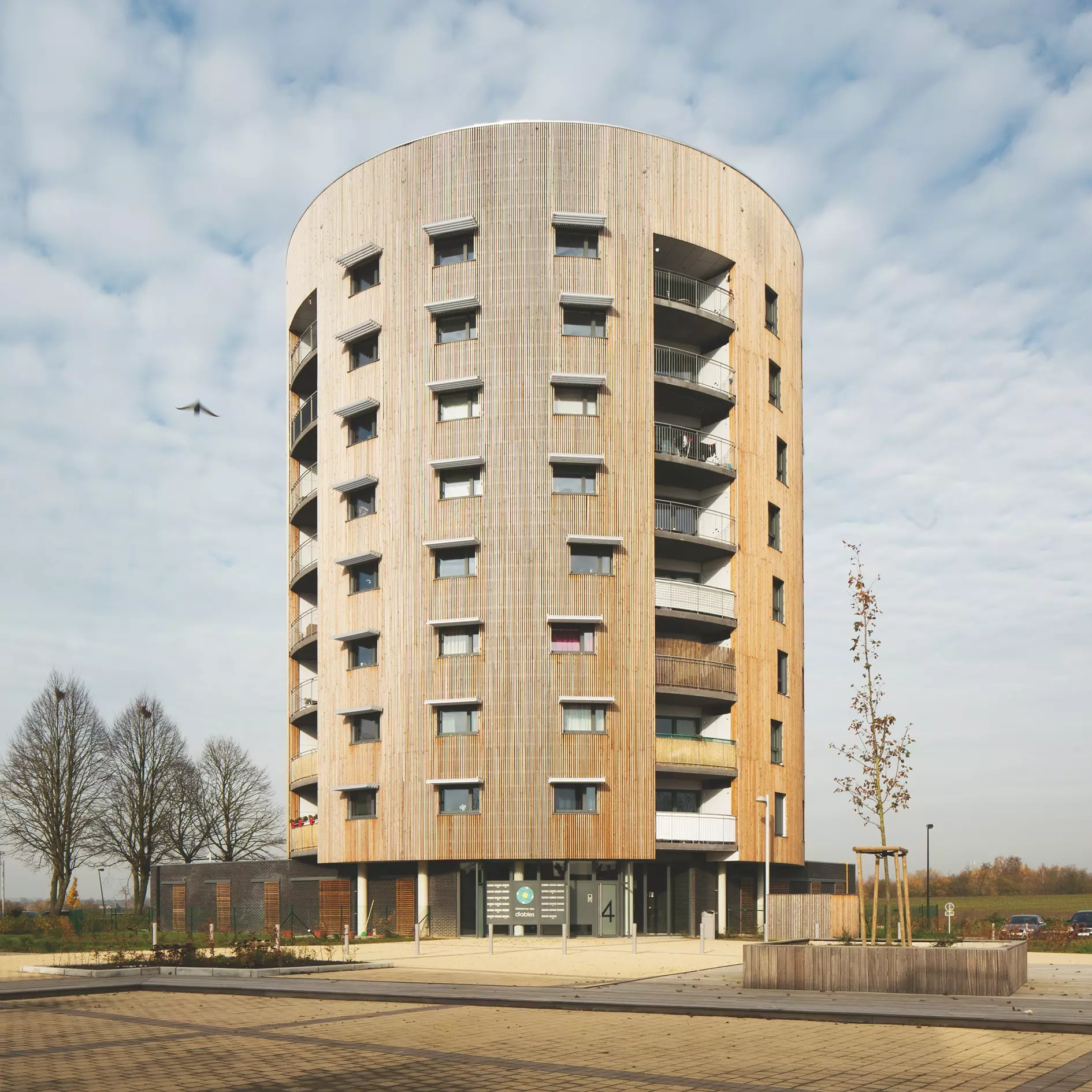 Ce complexe immobilier énergétiquement exemplaire prend place avec, pour totem, une haute tour cylindrique. Composée de trente-cinq logements rayonnant sur 360° et construite sur les ruines d'un ancien bâtiment, la résidence marque le paysage et symbolise le renouveau du quartier.