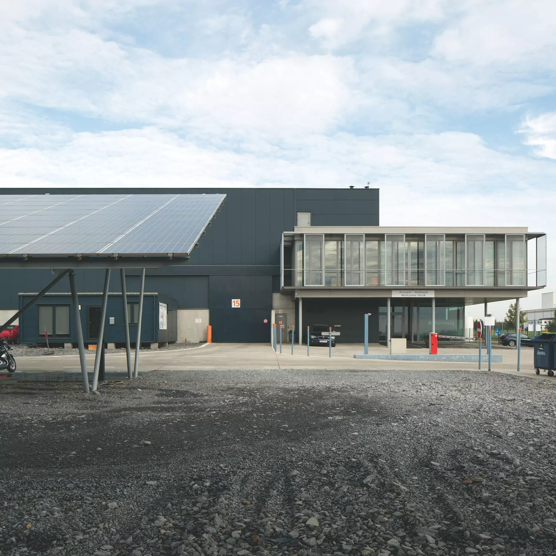 La société Decube, bureau spécialisé dans le transport et la production d'électricité d'origine renouvelable, a implanté un ensemble de près de 6 500 m², composé de trois entités : un vaste hall industriel, une zone de bureaux accolée et un vaste carport.
