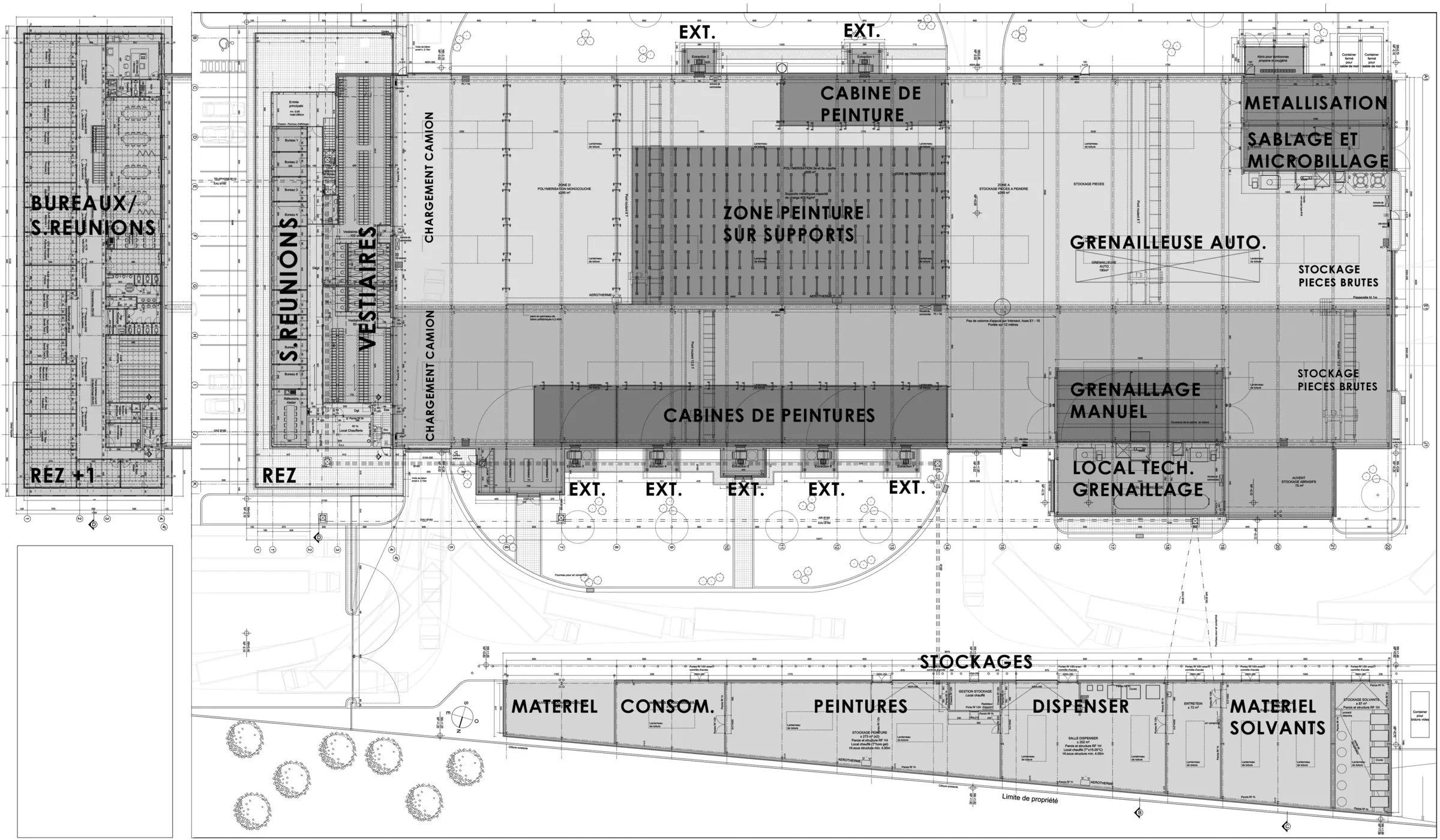 L'acier est omniprésent, optimisé afin d'alléger structurellement au maximum la construction. La façade des bureaux fait l'analogie avec l'image d'une puce électronique agrafée sur un process industriel, intégrant des éléments pare-soleil et coursives extérieures.