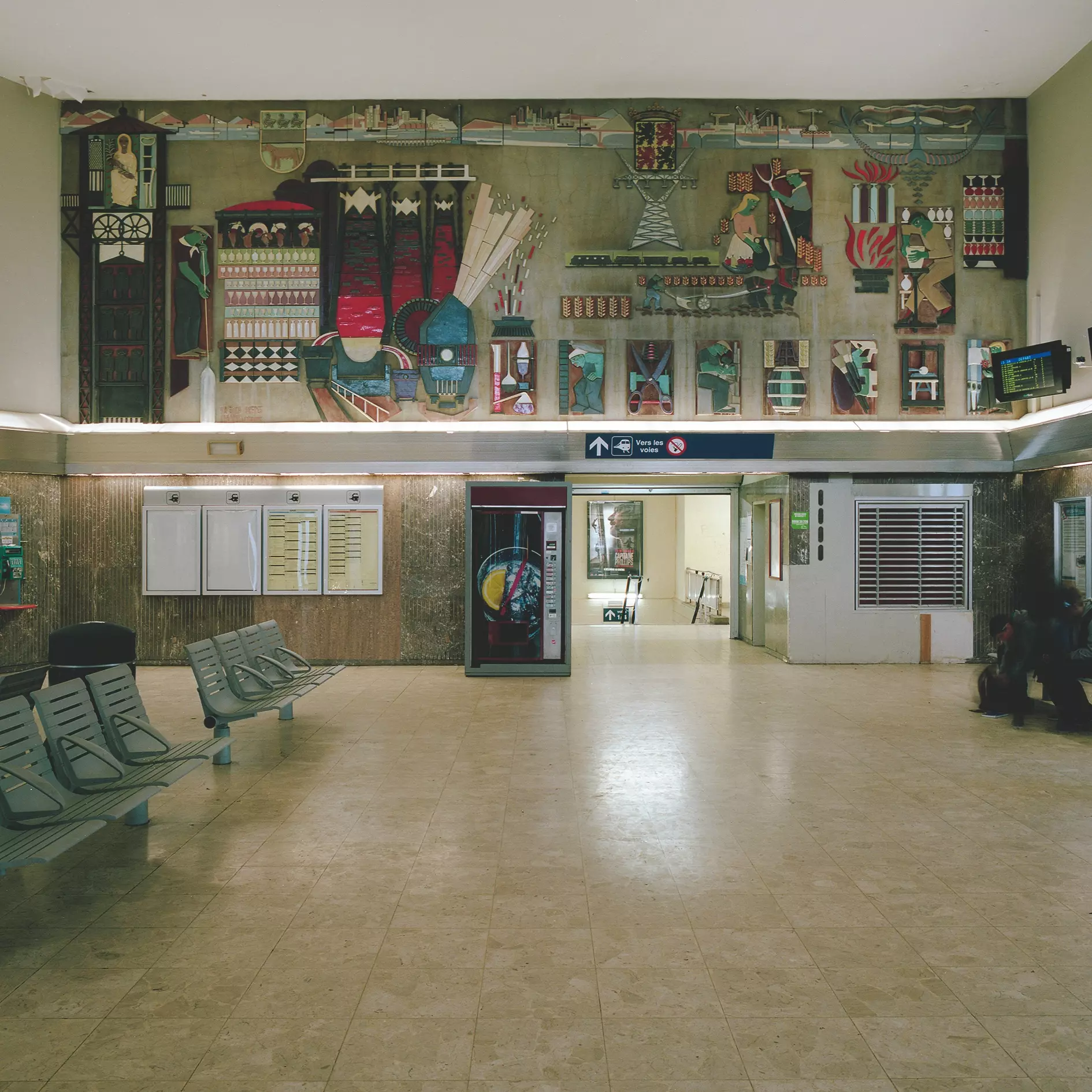 La construction coïncide avec l'érection, sous le maïorat de Fidèle Mengal (de 1953 à 1976), d'autres équipements collectifs : théâtre, piscine, hôtel de ville. La gare possède un plan trapézoïdal simple sur trois niveaux et toitures plates. La façade principale, légèrement arquée et tournée au nord vers le centre de la ville, en constitue le grand côté.