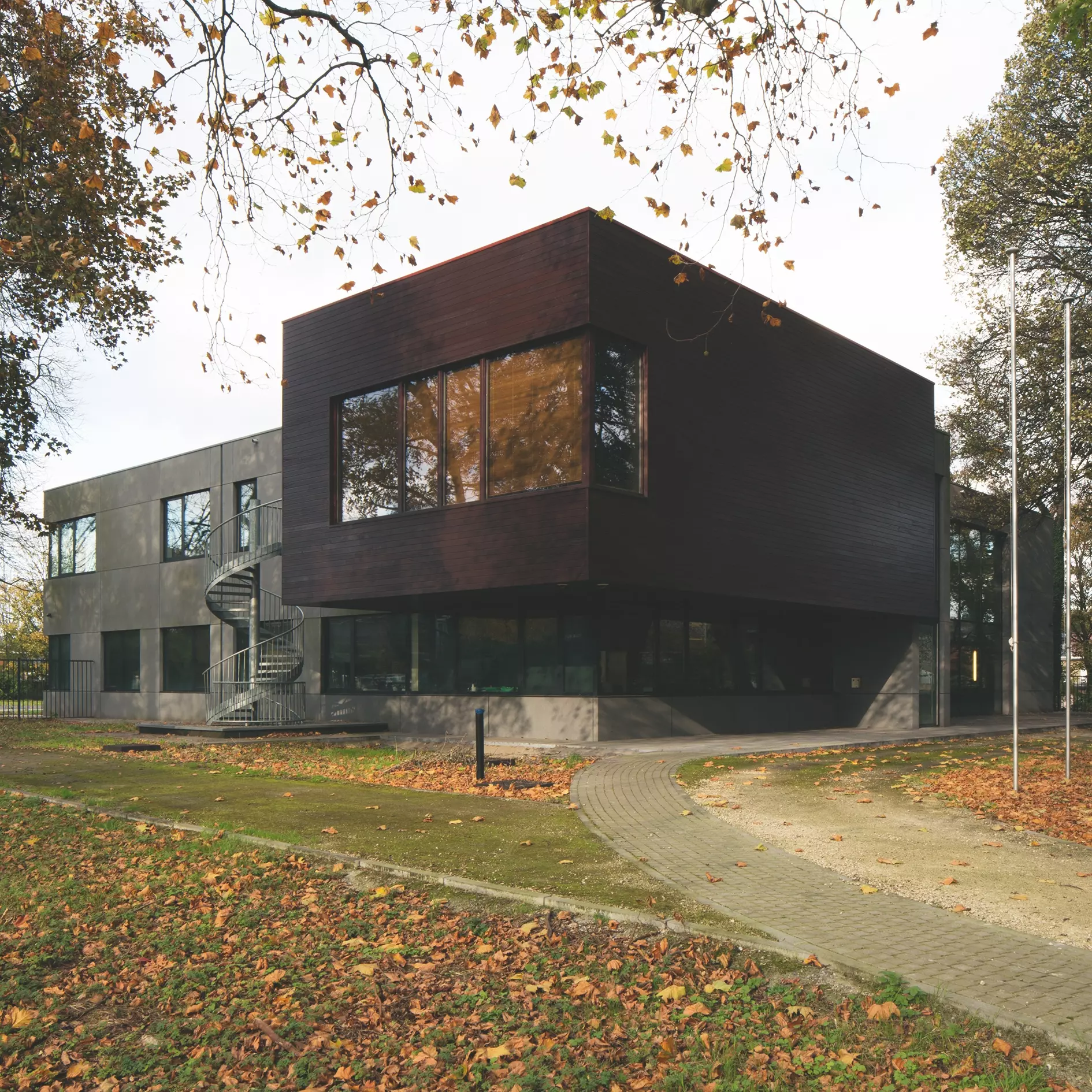 En plein centre du parc Gilsoco – le long d'un des axes pénétrants de la ville où le tissu urbain est composé exclusivement d'habitat mitoyen –, le nouvel édifice s'implante, de manière discrète, en recul par rapport à la voirie et caché par de grands arbres.