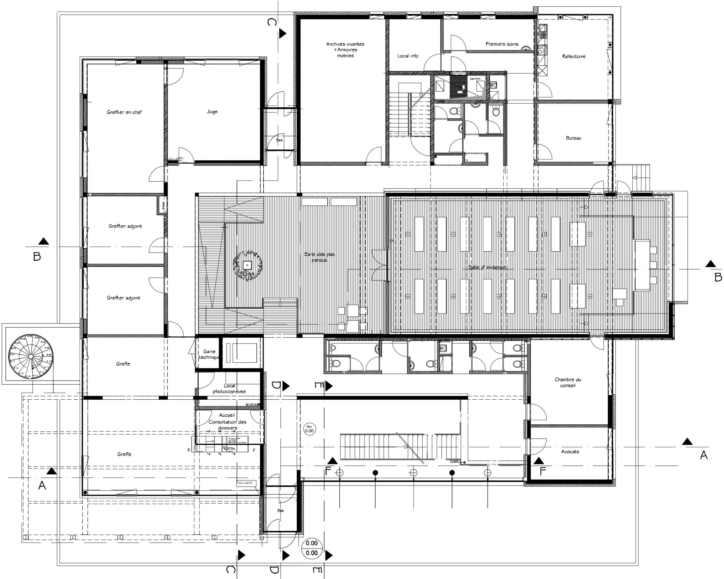 Le bâtiment, composé de deux volumes parallélépipédiques, s'inscrit dans le paysage. Posé au sol, le premier privilégie le béton et le verre, tandis que l'autre (salle d'audience), emboîté et surélevé est bardé de bois. La salle des pas perdus desservant l'ensemble de la construction est inondée de lumière zénithale.