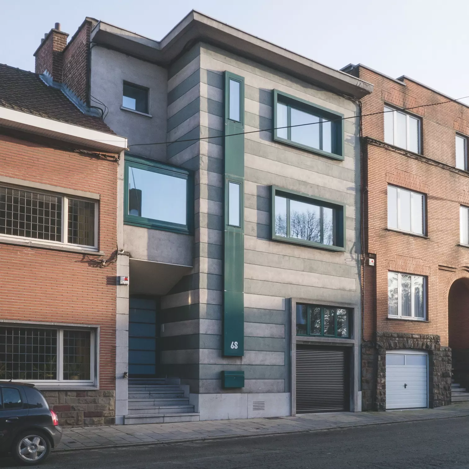 Réinterprétation formelle du projet non réalisé de l'habitation de Joséphine Baker à Paris (Adolf Loos, 1928), dans une attitude postmoderne comparable à celle de Bob Van Reeth à Anvers (maison Van Roosmalen, 1988), ce modeste projet consiste en la transformation de la façade à rue d'un bâtiment de l'entre-deux-guerres, à toiture plate, pour devenir la maison personnelle de l'architecte.