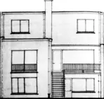 La façade est traitée comme une peinture abstraite en trois couleurs (noir, brun, blanc) avec peu d'ouvertures, l'essentiel des pièces de vie (salle à manger et living) étant tourné vers le jardin.