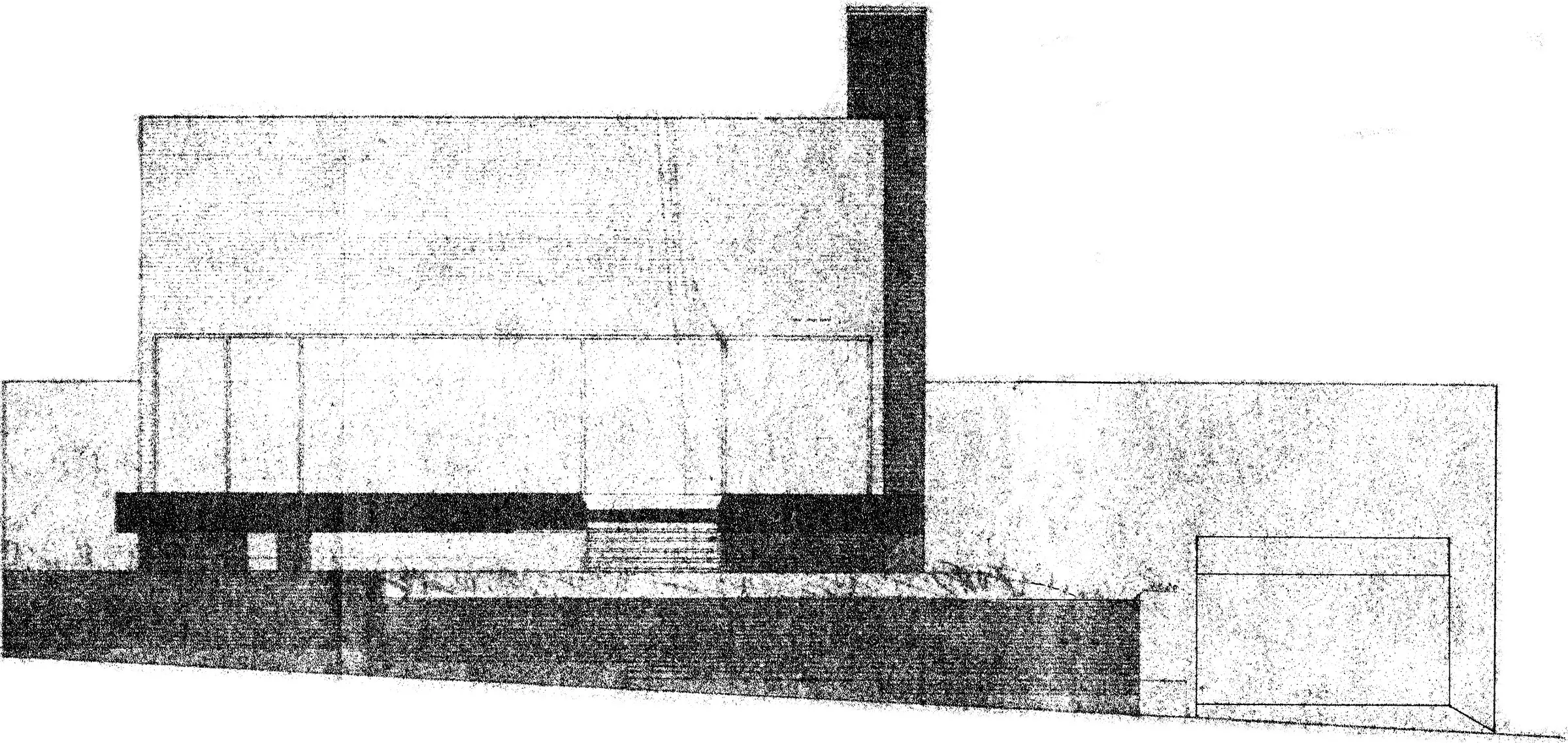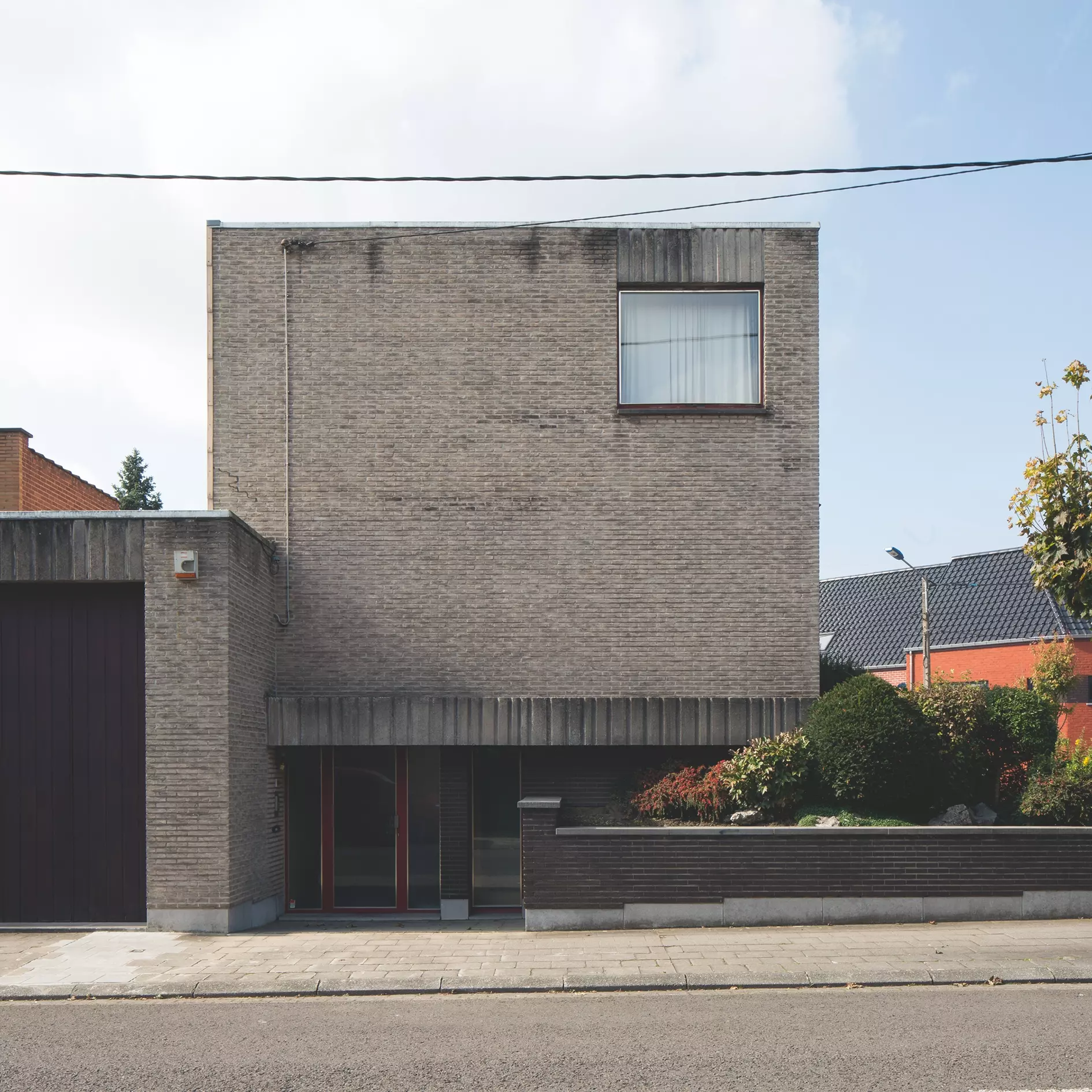 Au centre de la composition, un parallélépipède dépouillé, corps principal de l'habitation, est détaché du sol par un large bandeau en saillie. Il s'adosse de manière asymétrique à un volume secondaire bas et long en arrière-plan reprenant le garage. Celui-ci se déploie le long du côté mitoyen. Une cheminée, seul élément vertical, articule l'ensemble. Enfin, un muret bas définit la limite entre la rue et le jardin à demi-niveau dans lequel on accède via un escalier aérien en béton.