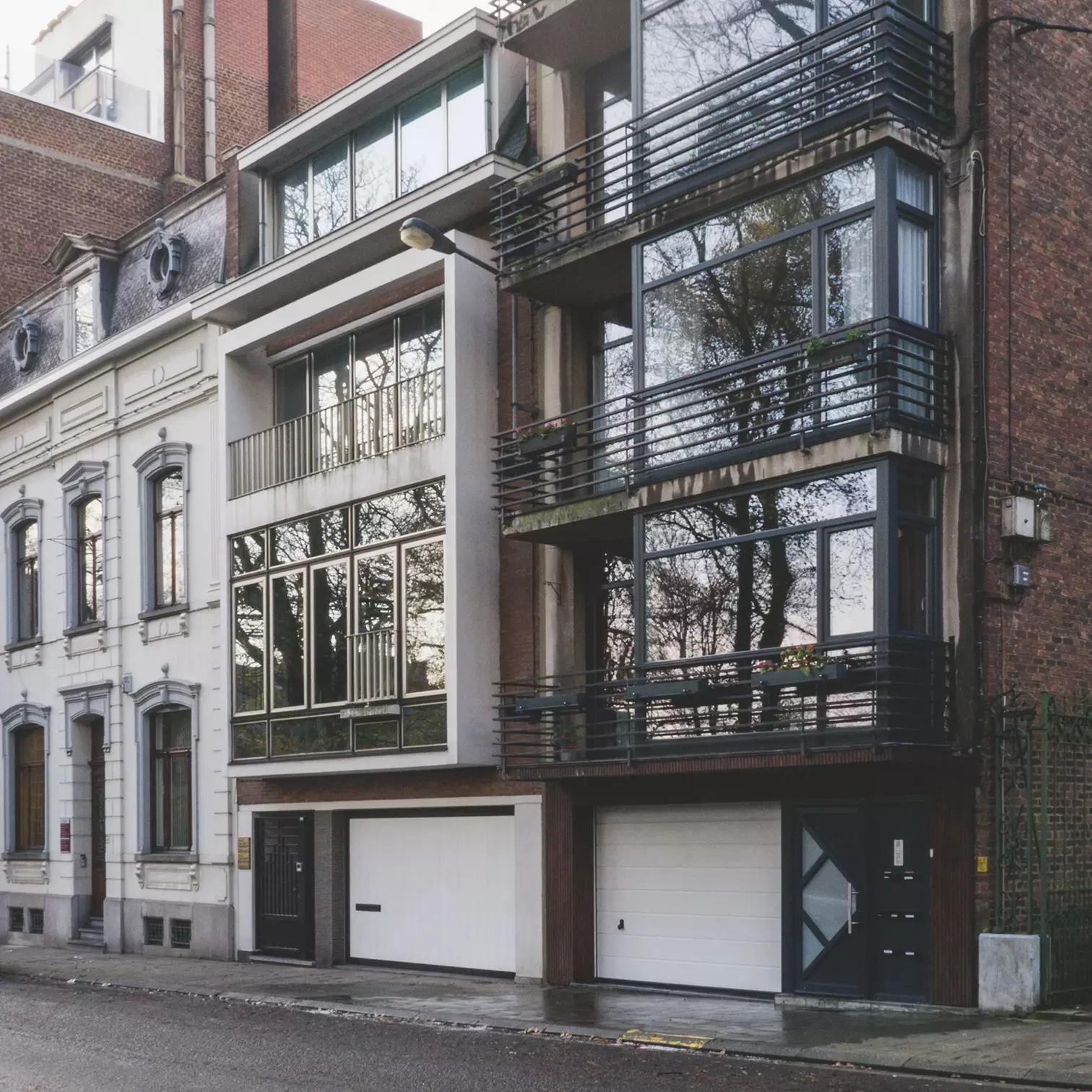 La construction remplace une maison bourgeoise éclectique du début du XXe siècle face au parc de La Louvière. Le projet, destiné à un couple de médecins, est du type bel-étage et témoigne d'une composition et d'une finition soignées, comme l'immeuble à appartements voisin.