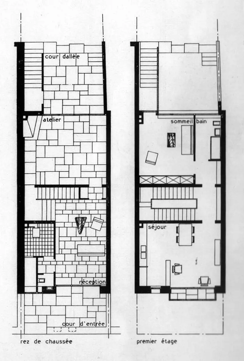 Le système constructif est aussi conventionnel – murs portants en maçonnerie, planchers en hourdis de terre cuite armés – à cause des contraintes économiques de l'après-guerre. La façade vers la Meuse est habillée en moellons de grès alors que celle vers le jardin est en briques peintes à la chaux. L'atelier et les deux cours sont recouverts de dalles de grès, mais l'espace de réception a un revêtement récupéré d'une démolition, tout comme les tuiles grises de la toiture à versants. Les plans utilisent un minimum d'éléments, en les mettant en forme pour garantir la qualité des volumes.