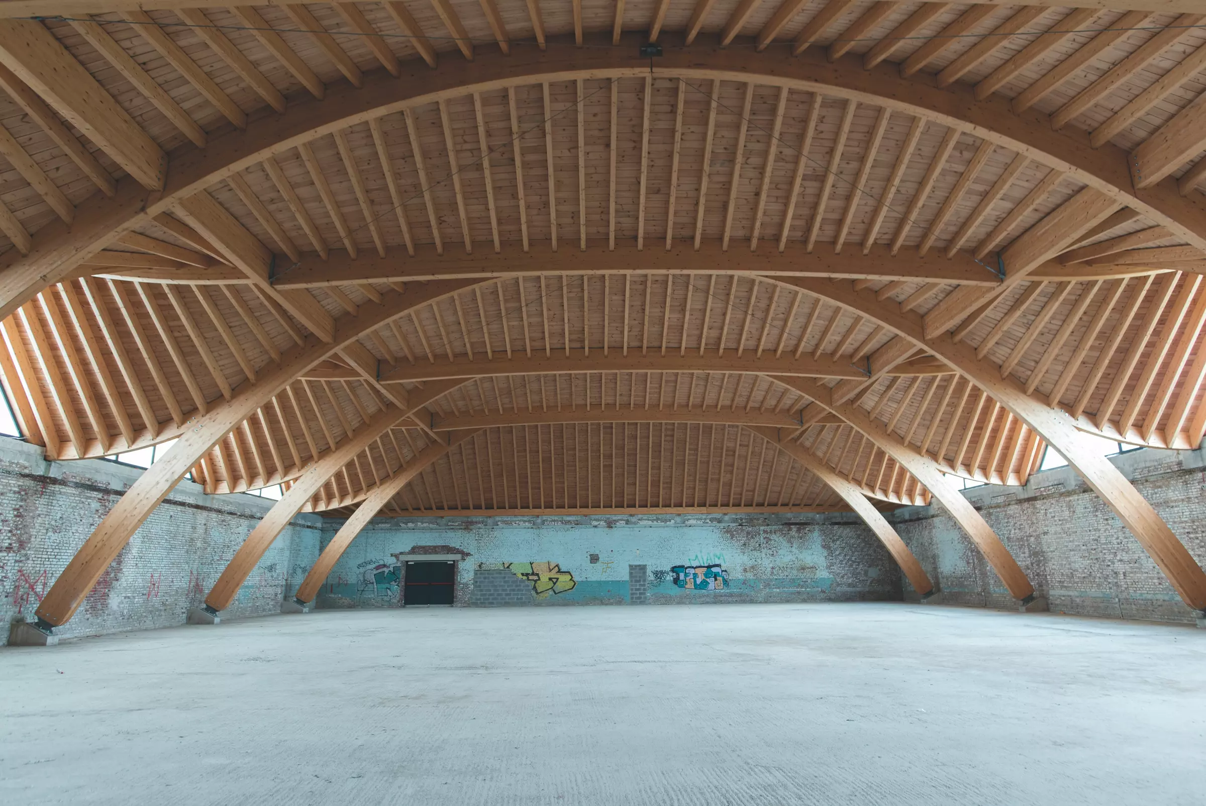 Soucieuses d'assumer les interventions contemporaines et d'optimiser la fonction sportive, les nouvelles structures se déclinent en bois plutôt que de réinterpréter les anciennes charpentes métalliques. Si la nouvelle affectation permet la mise en valeur de ce témoin de l'industrie, on comprend également que sa position de porte urbaine et sa proximité avec le RAVeL rendent pertinente cette reconversion à de multiples échelles.