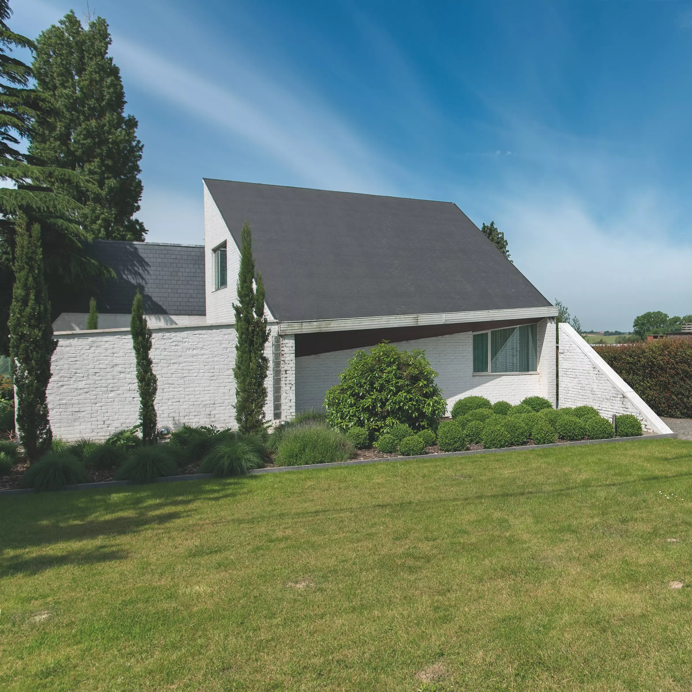 L'habitation se situe à quelques kilomètres du centre de Leuze-en-Hainaut, en recul d'une route nationale. Bien que peu entourée, elle se fond dans son environnement bâti et naturel, dont elle respecte les hauteurs et gabarits. Ses lignes obliques, tirées du sol jusqu'au faîtage, contribuent encore à son intégration au contexte. Autour de la parcelle, un bas muret délimite la propriété et amorce le parcours vers l'entrée. En son sein, la maison est divisée en deux par un hall et un jardin d'hiver avec terrasse. Le lien intime unissant les propriétaires à l'architecte a offert à celui-ci une grande liberté de conception, que l'on peut lire à travers l'expression plastique des volumes. L'accentuation des obliques, le jeu des percements ainsi que l'utilisation du verre et de l'acier sont caractéristiques de l'architecture moderne des années 1950.