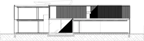 Tandis qu'au second niveau, le bloc technique et la modénature du plafond condensent la tension entre les deux géométries, la composition des façades n'en laisse rien transparaître.