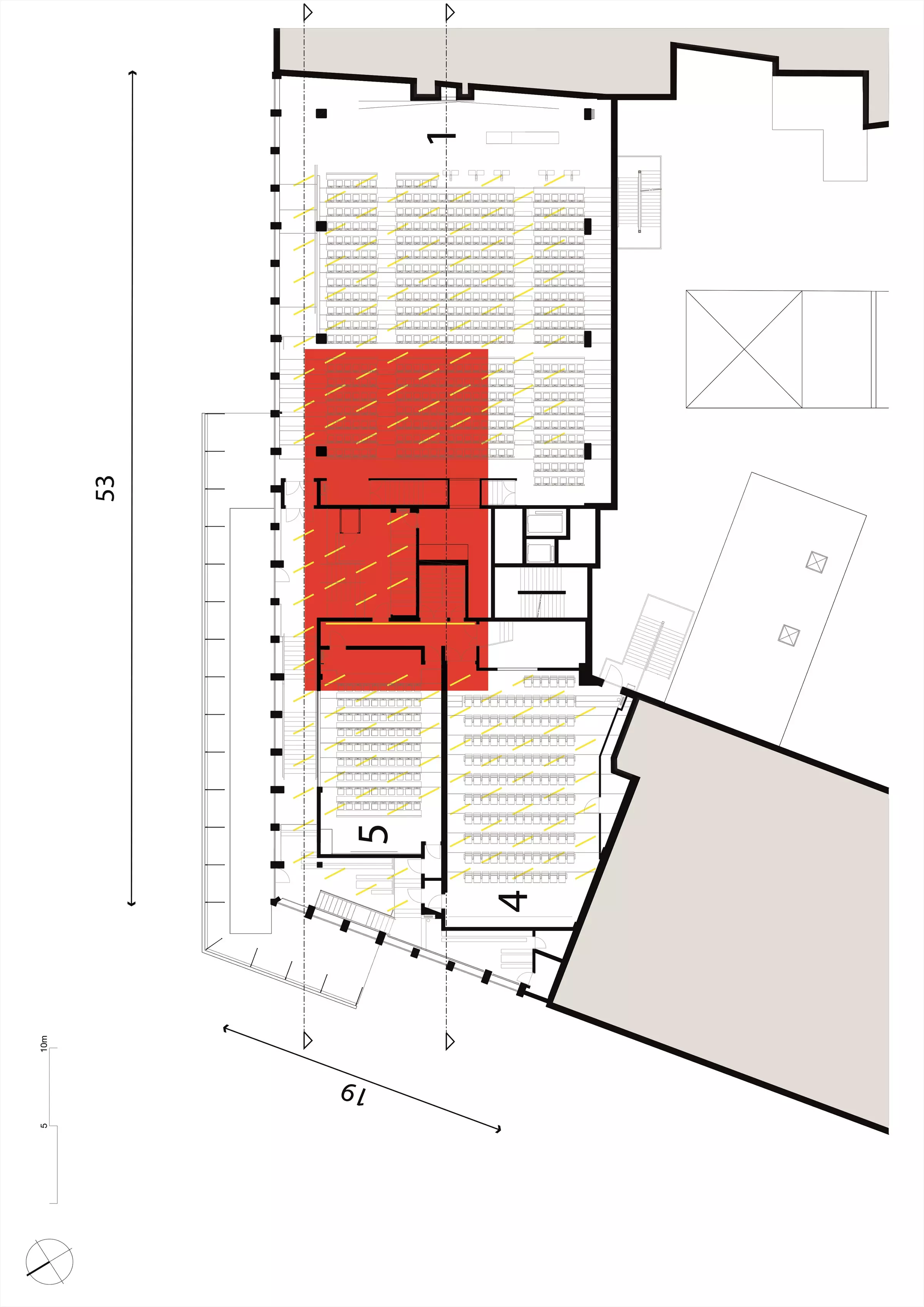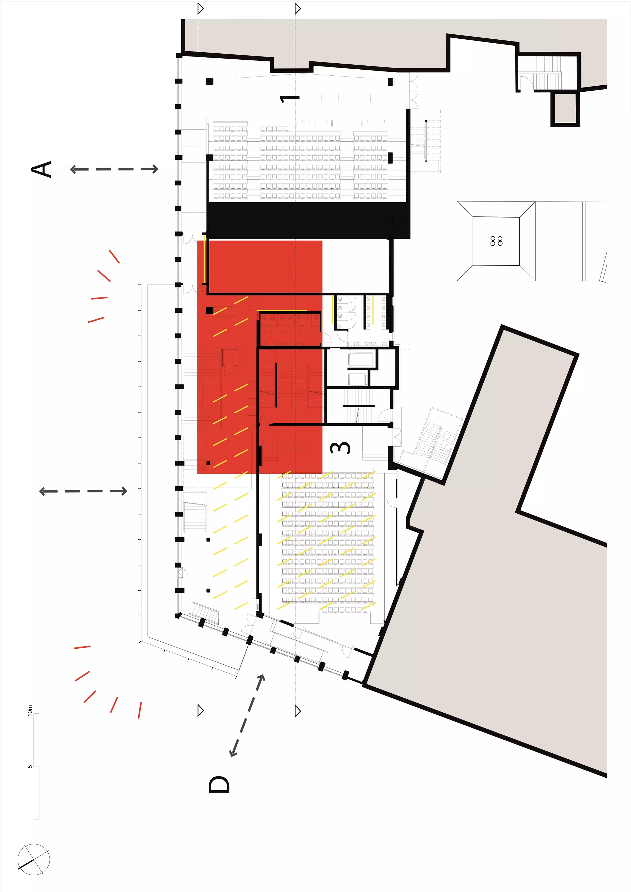 Cette réaffectation d'un complexe cinématographique en amphithéâtres – un de 500, deux de 250 et un de 89 places – témoigne des possibilités d'adapter ce type d'édifice des années 1980.
