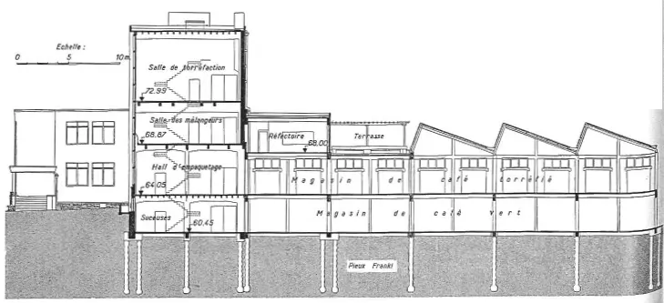 En pleine expansion, la société acquiert, en 1953, un vaste terrain le long de l'axe Liège-Maastricht, permettant la construction d'un siège aisément accessible alliant bureaux, manufacture et distribution. Les nombreux impératifs techniques du programme sont le prétexte à développer un fonctionnalisme élégant, faisant la part belle aux matériaux standardisés. Orienté plein nord, le bâtiment de production, où se superposent, en liaison avec les magasins situés à l'arrière, les phases de traitement du café, s'ouvre sur l'avenue Georges Truffaut par de hautes parois verticales de béton translucide.