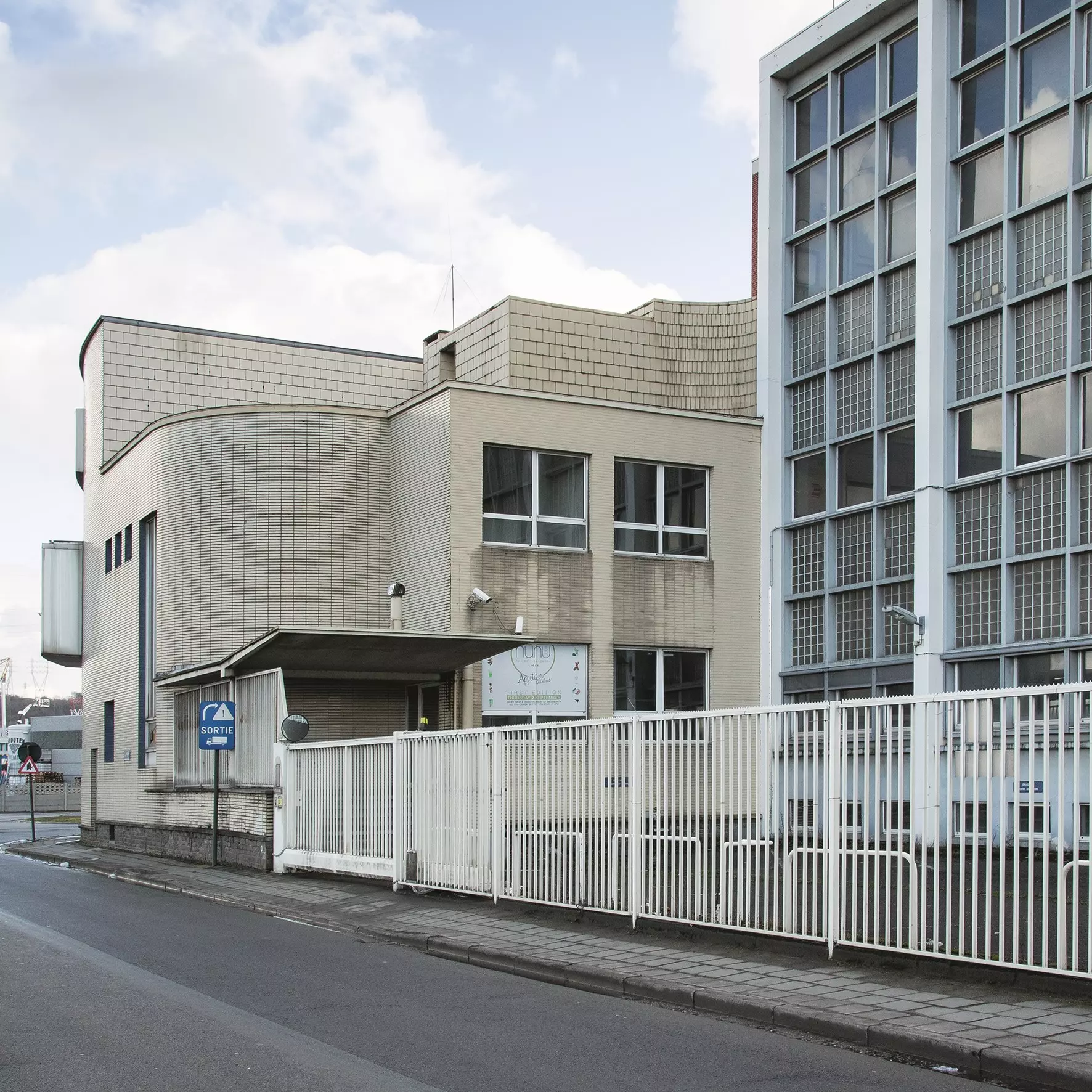 En contrepoint, le volume bas de l'aile de bureaux, habillé de plaquettes de grès blanc, épouse la courbe de l'avenue de Jupille ; le rythme répétitif des fenêtres n'y est interrompu que par le bureau du directeur, en saillie, et l'accès des camions vers la cour et les garages, couverts de sheds. Reliant ces deux volumes, l'espace d'accueil, marqué en façade par un auvent en béton, abrite un escalier courbe sculptural.