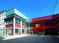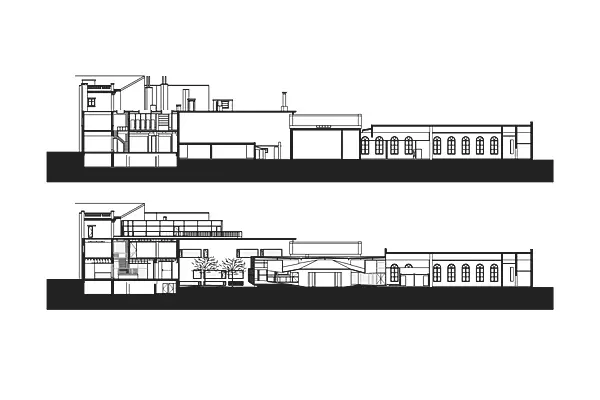 Les architectes font le choix de conserver l'expression industrielle des bâtiments (structure en béton et remplissage en briques, plafonds en béton brut, grandes baies de garage à portes coulissantes, garde-corps en fer forgé), tout en les conformant aux normes énergétiques et de confort actuelles : les châssis en maçonnerie de béton sont doublés par l'intérieur, les panneaux acoustiques partiels laissent le plafond visible. L'une des ailes du bâtiment est surélevée d'un niveau et une agora est créée par l'ajout d'une paroi vitrée. Les interventions plastiques de J. Glibert confèrent au lieu chaleur et lisibilité. Une grande partie des parois vitrées est de couleur orange, réfléchissante ou transparente. Au mur, l'orange fluorescent signale les zones de circulation verticale. Au sol, un carré jaune traverse les murs. Il redresse l'espace et constitue aussi un ferment d'unité.