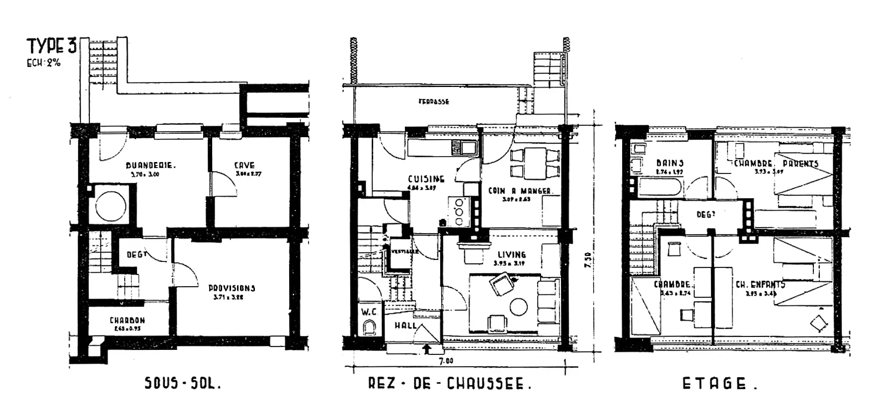 Un Concours national d'architecture est lancé en 1947 par le ministère de la Reconstruction. La proposition du Groupe E.G.A.U. est adoptée l'année suivante. Le nouveau quartier est constitué de trente-neuf maisons pour des familles ayant perdu leur logis et de six pour la Société nationale des habitations à bon marché (SNHBM). Le plan d'implantation propose une répartition ouverte des maisons mitoyennes, rassemblées en groupes homogènes de cinq et six unités, profitant d'un terrain de quasi 1 ha en pente douce, permettant un ensoleillement et une aération confortables. Plusieurs typologies, allant de 45 m² au sol à 53 m², répondent aux nécessités des familles.