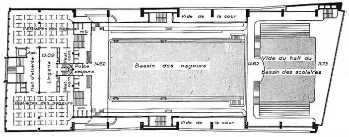 La distribution, fonctionnelle, répond à deux préoccupations essentielles : faciliter l'itinéraire des différentes catégories d'utilisateurs et assurer des conditions d'hygiène optimales. Esthétiquement, l'architecte conjugue caractère rationnel et monumentalité, modernisme et classicisme. La volumétrie du grand hall évoque celle de la piscine de la Butte aux Cailles à Paris, construite de 1922 à 1924 d'après les plans de Louis Bonnier.