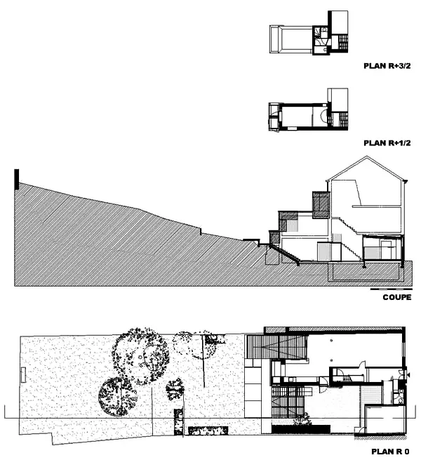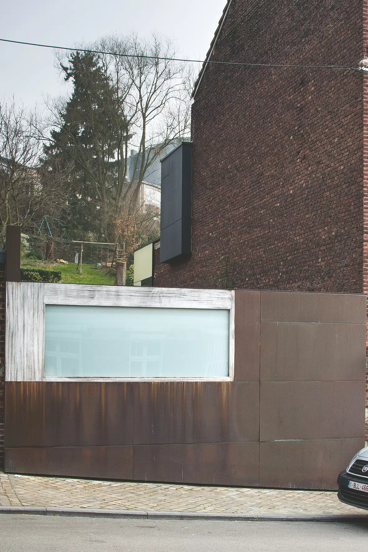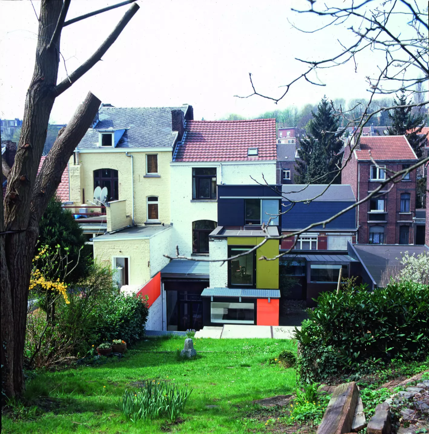 Dans un quartier escarpé d'habitations modestes en rangées, une dent creuse a permis de déployer latéralement et vers un jardin à forte déclivité les éléments divers et variés d'une mutation complexe, inventive, à la fois transformation et extension d'une petite maison, dans une savante dissémination de retouches et d'adjonctions qui ont le chic de sembler un semis de confettis.