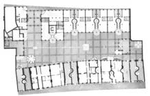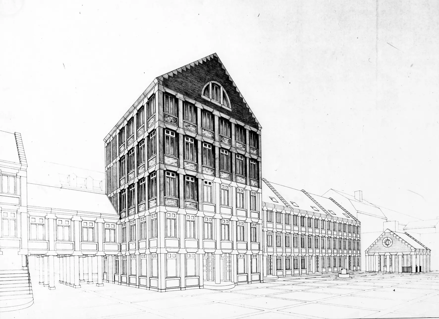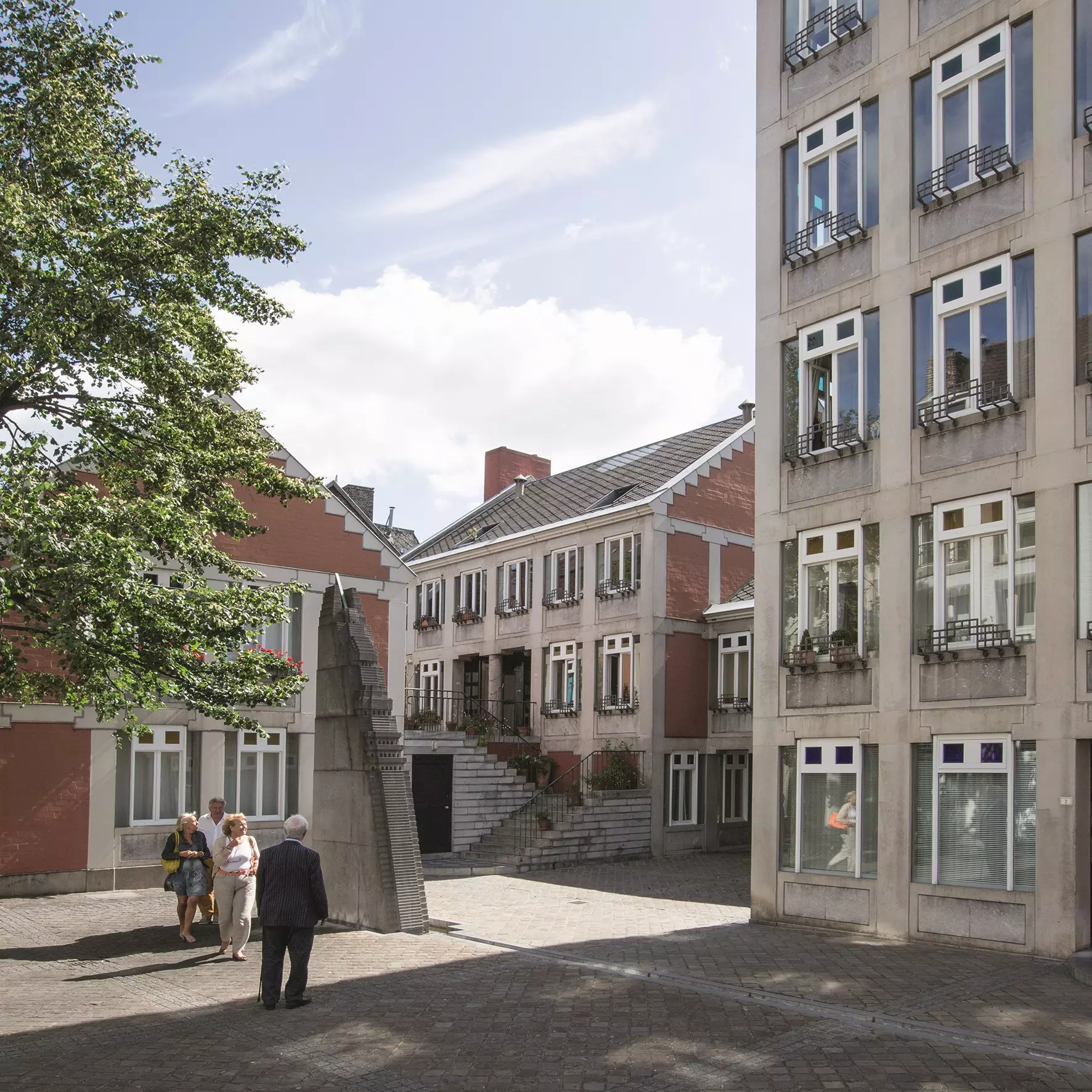Commandé en 1978, le complexe est, à l'origine, entièrement dévolu à l'habitat. L'architecte y combine la restauration – très personnelle – de maisons des XVIIe et XVIIIe siècles en front de la rue Hors-Château et des constructions neuves pour refermer une place uniquement accessible à pied par deux connexions transversales aux rues existantes. Élevés sur un parking souterrain, les nouveaux édifices articulent, sur un long côté de l'esplanade, une tour à appartements conçue selon le critique d'architecture Geert Beekaert « comme une immense maison avec une toiture à deux pans » et une rangée de constructions plus basses, toutes deux en béton préfabriqué apparent avec parement de marbre en allège ; les façades des petits volumes implantés latéralement intègrent, quant à elles, la brique peinte en rouge.