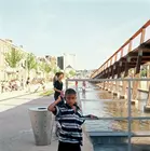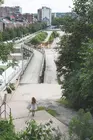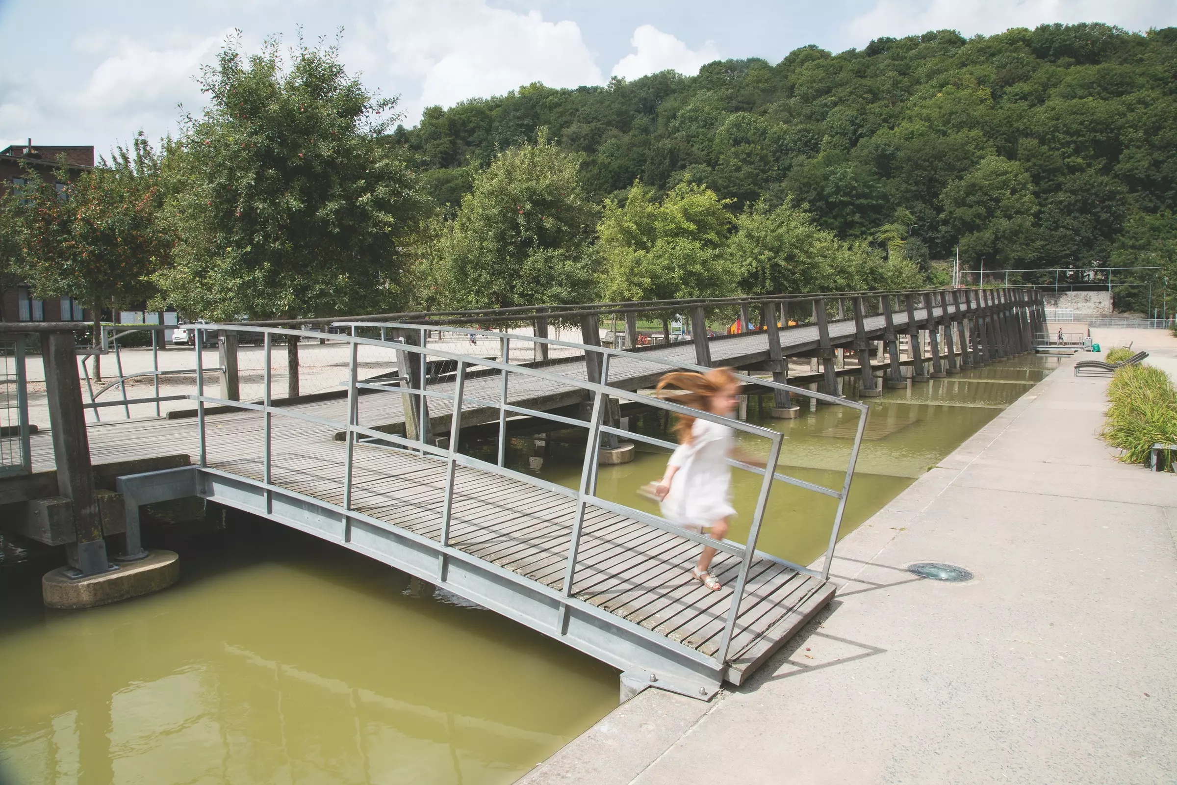 Les auteurs affinent leurs choix au gré de la concertation, multiple, intégrant pouvoirs publics, société civile et habitants. Côté Meuse, aux platanes de la place des Déportés (parking) et des aires pavées qui la jouxtent, succède l'esplanade : sous les sept auvents en cuivre prépatiné – halte par temps de pluie – elle embrasse un large espace en béton ocre, appropriable par tous, décliné en gradins, ceinturé d'érables et de haies. À l'approche des coteaux, des pommiers gagnent pelouses et la plaine de jeux, comme cette passerelle en bois qui enjambe le bassin, empreinte de l'ancienne darse, et qui surplombe à son terme un terrain multi-sports. Le remarquable mobilier est conçu par l'équipe, comme les poubelles et luminaires. Au dessin et à l'entretien élémentaires, il combine acier galvanisé et afzelia, déclinant les différentes positions du corps : chaises longues, pans inclinés, adossoirs, tables de pique-nique et un modèle de banc – la seule pièce de catalogue (Marina de Mobles) adoptée depuis lors par la ville pour ses autres espaces publics.