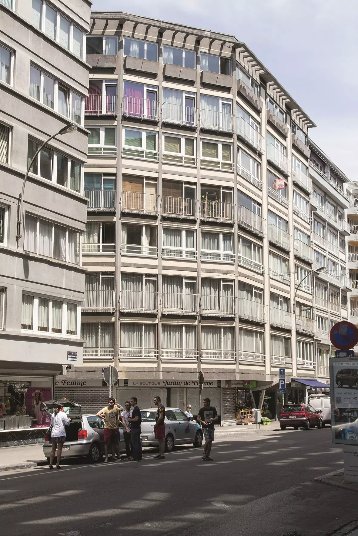 tournant dans les travaux de reconstruction du centre dans l'immédiat après-guerre. Sur un sous-sol de parking, elle s'étage sur deux niveaux reliés par un escalier monumental combiné à un escalator, sous une verrière du Val Saint-Lambert et face à un vitrail de J. Rets. Les entrées sont surmontées de larges auvents, récemment démolis. Aux six niveaux supérieurs, sur les 70 m de la façade arrière, les cinquante appartements sont distribués par des coursives qui ne sont pas sans rappeler l'architecture des paquebots transatlantiques en vogue à l'époque. Les façades à rue, en pierre reconstituée petit granit, sont percées d'ouvertures généreuses et marquées par l'horizontalité.