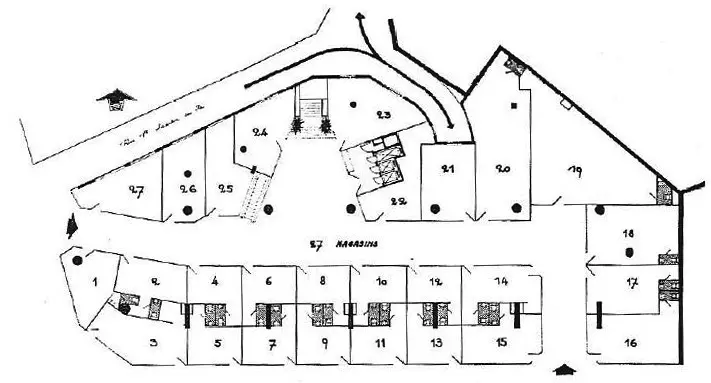 En ossature béton armé, cette galerie de quarante-trois magasins marque un