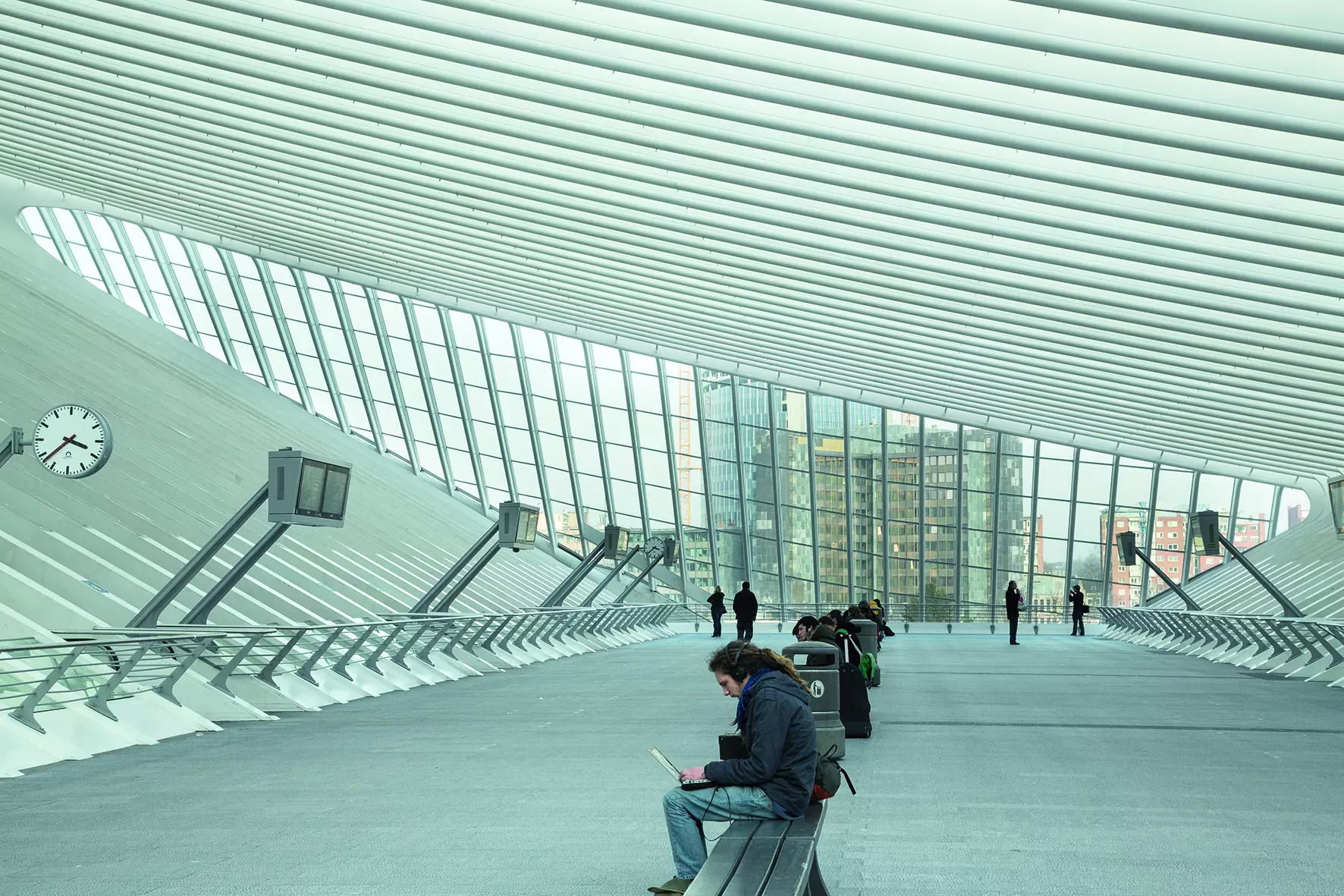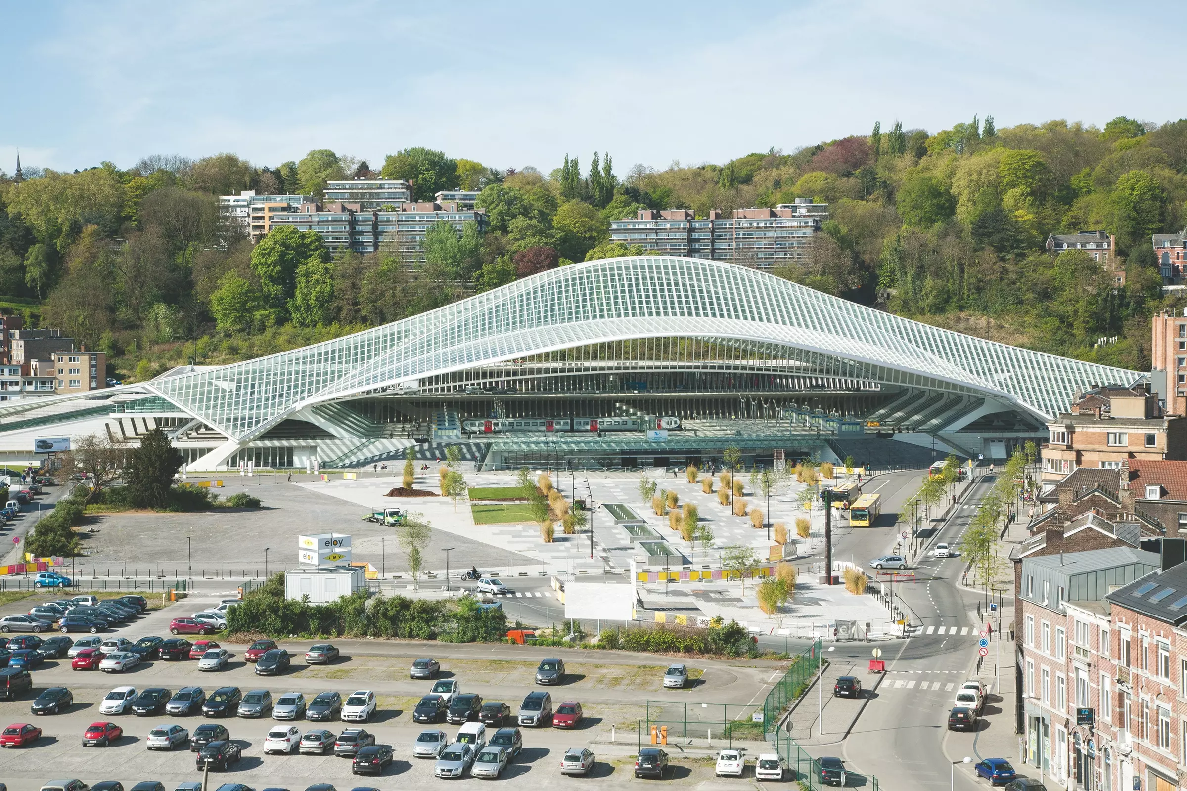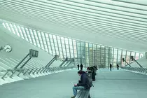 Accessible depuis l'autoroute grâce à l'élégant pont haubané, partie intégrante du projet, et proche des autres moyens de transport (bus, taxis), la gare sert aussi de liaison piétonne entre les quartiers de la colline de Cointe et des Guillemins grâce à deux passerelles. Revendiquant une gare « sans façade », Calatrava joue des lumières et des ombres, des lignes et des volumes. À l'intimité de la galerie sous les voies répondent la majestueuse grande arcade et le volume immense sous la voûte aérienne de verre et d'acier.
