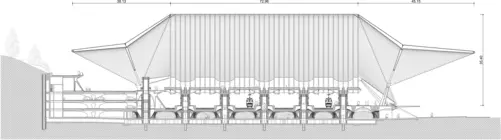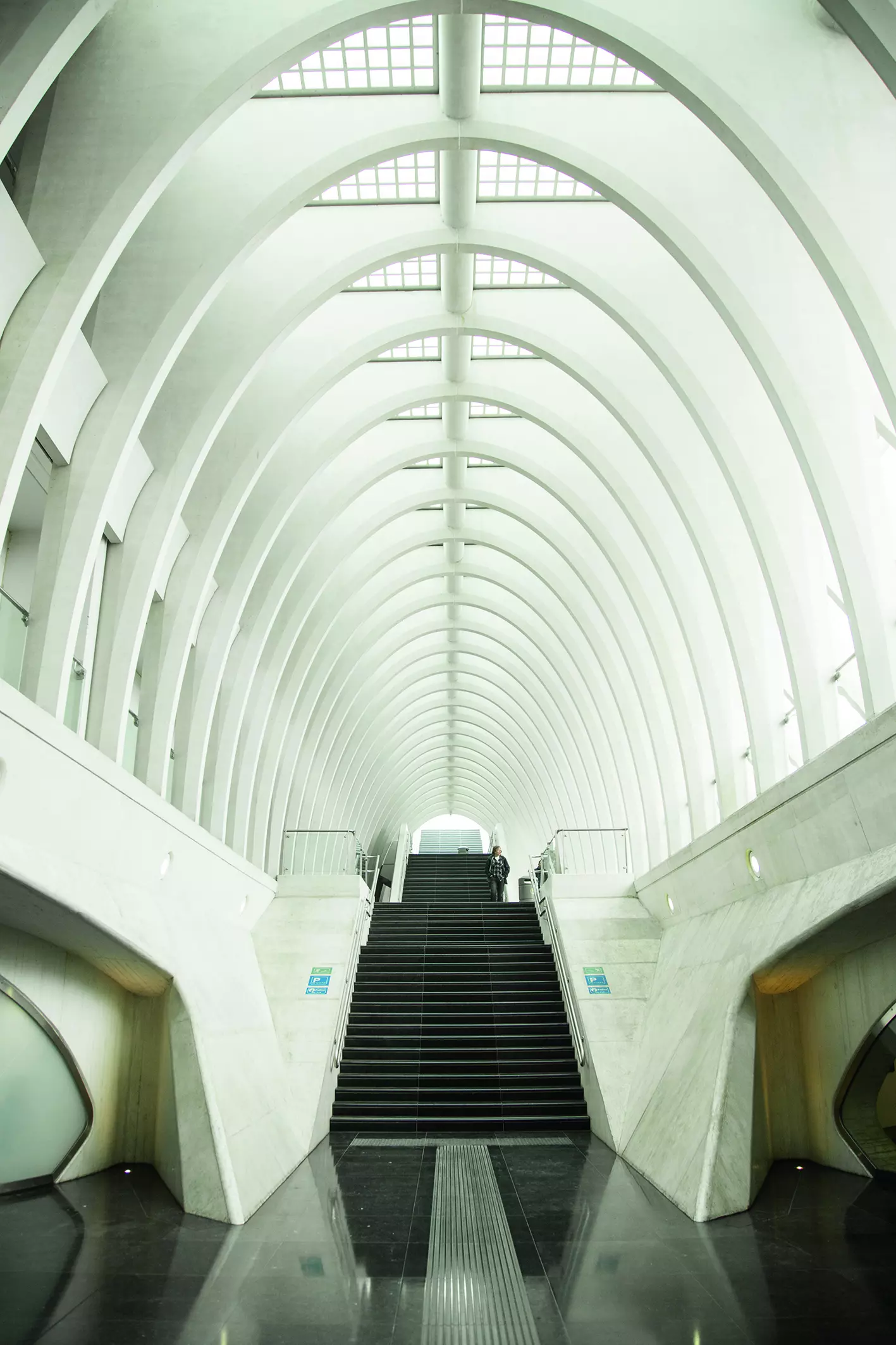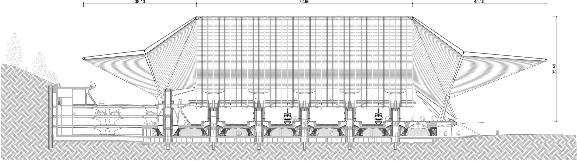 Semblable chantier, où le trafic ferroviaire n'est pas interrompu, nécessite une technologie de pointe. Constituée de trente-neuf arcs en acier culminant à 40 m et s'appuyant sur les passerelles, la voûte repose sur dix quadripodes inversés. De 2005 à 2006, une technique unique en son genre de poussages successifs à l'aide de vérins hydrauliques, développée par le bureau Greisch, permet l'installation de la structure, préalablement assemblée sur échafaudage. Vient ensuite la pose des auvents et du vitrage.