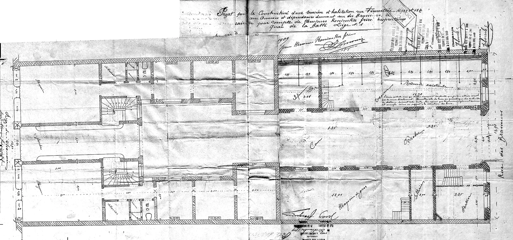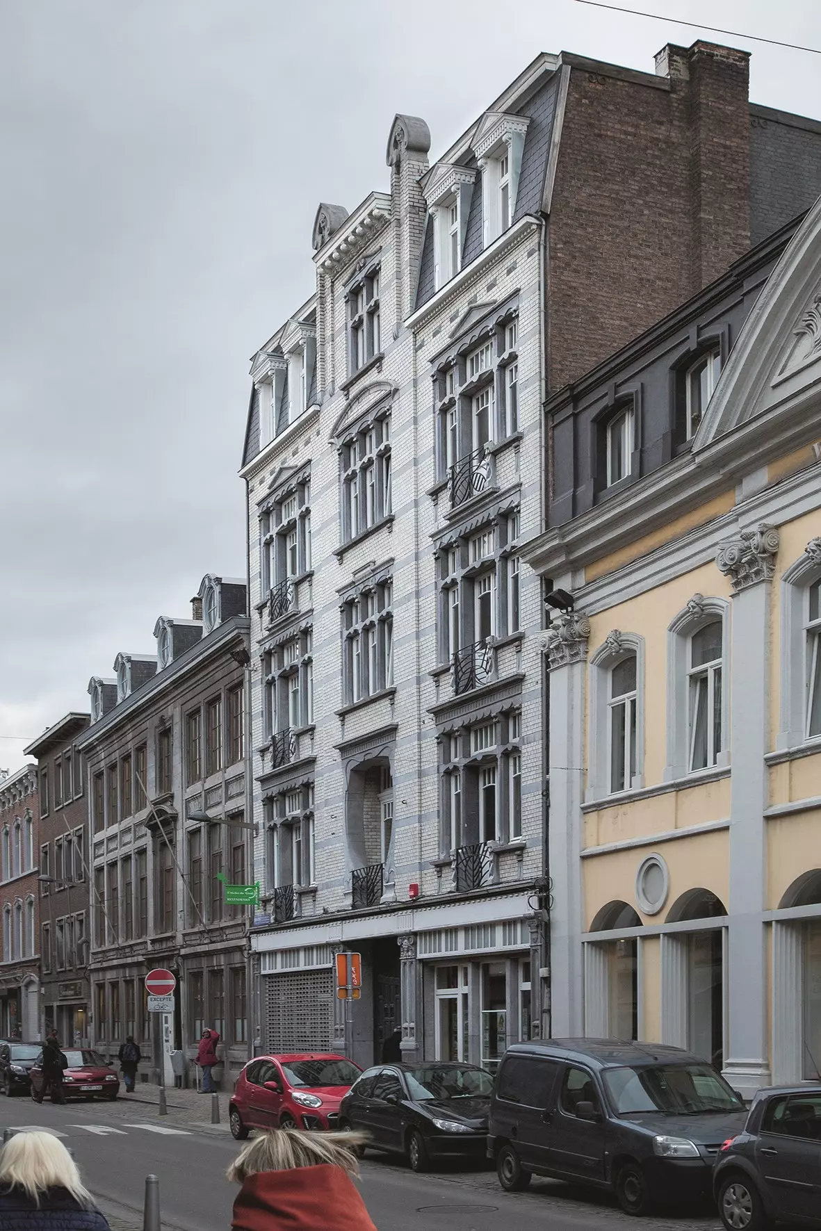 Doté à l'arrière de dépendances (écurie pour 8 chevaux), cet immeuble à la façade sévère, réalisée avec un parement de briques blanches marqué par des bandeaux en pierre bleue, impressionne par la composition symétrique prononcée, fondée sur un rythme ternaire, ainsi que par son aspect hybride – l'auteur du projet est entrepreneur, pas architecte – mélangeant des éléments de répertoires décoratifs disparates : corniches décorées avec des denticules, tympans, pilastres d'inspiration Renaissance qui cadencent la répartition des vitrines au rez-de-chaussée et soulignent l'entrée principale. Cette dernière est à son tour surmontée par la petite loge centrale du premier étage, unique ouverture du bâtiment encadrée par une corniche en pierre bleue modelée selon des lignes courbes et ornée d'éléments végétaux. Goût Art nouveau et exercice académique se fondent dans cet immeuble de rapport – typologie encore peu répandue à Liège dans les années 1910 – qui maintient toutefois un caractère de pastiche.