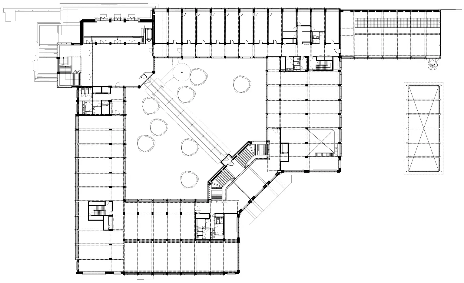 En arpentant les 2 ha du bâtiment, l'utilisateur perçoit l'extrême diversité dans l'agencement des espaces, des perspectives et des vues sans cesse renouvelés sur la Meuse et le site. Cette apparente complexité est le résultat d'un subtil enchevêtrement de volumes, dont l'expressionnisme géométrique est d'une rare qualité. Le plan du bâtiment est pourtant simple, adoptant la forme d'un carré, auquel se greffe le bâtiment rectangulaire du laboratoire d'hydraulique. Ce carré délimite une cour intérieure, occupée par deux grands auditoires superposés qui la traversent en diagonale. Aux deux extrémités, les angles accueillent entrées et circulations verticales, dont la finition intérieure est remarquable.