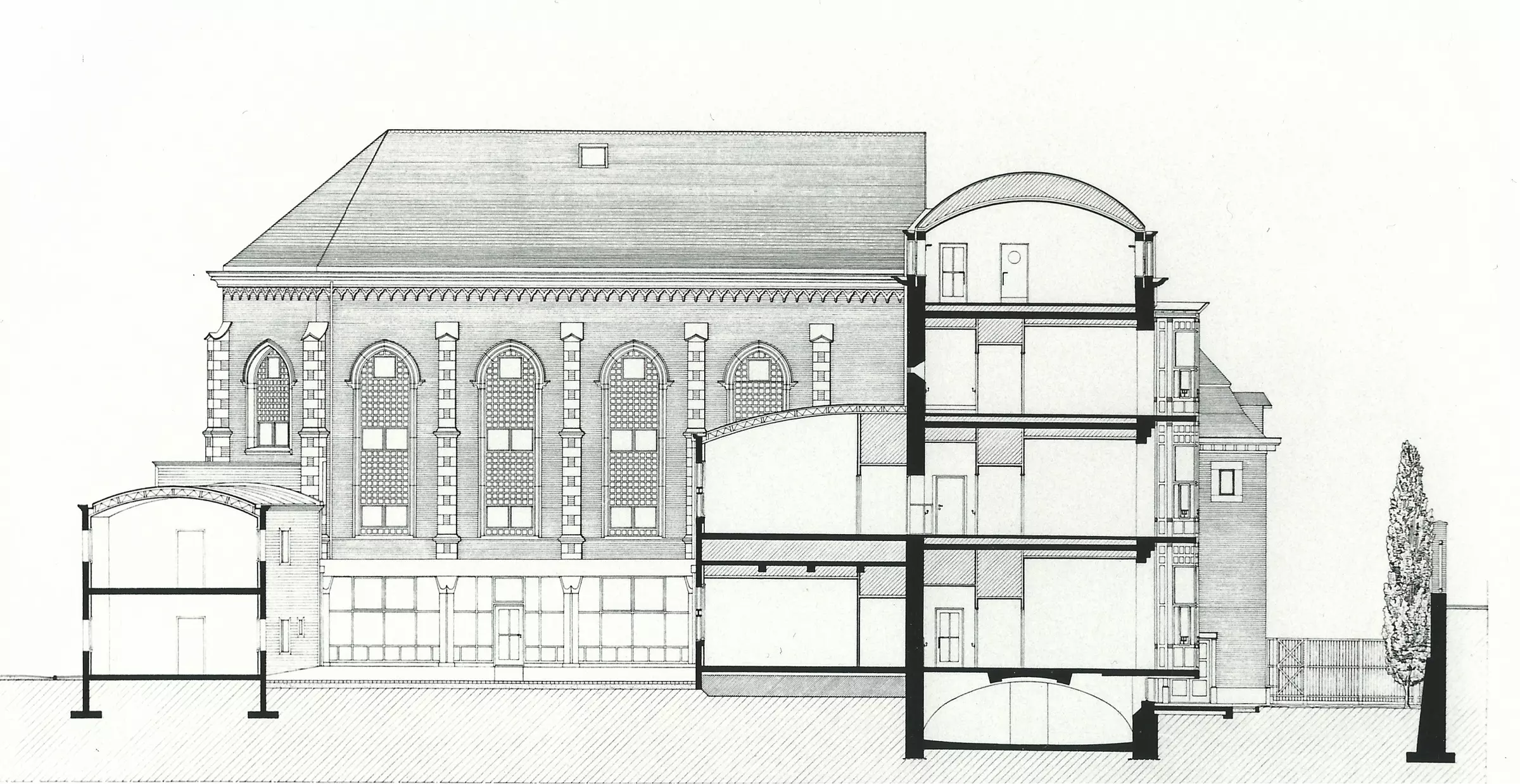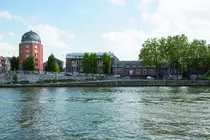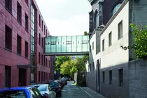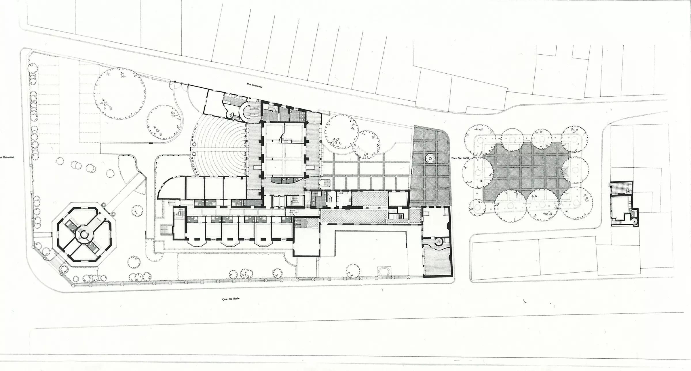 La décision d'élever une tour à l'angle du jardin, face au pont Maghin, en réponse à l'église située sur l'angle opposé, constitue le nœud du projet, et fait l'objet de plusieurs variantes. Offrant une visibilité au site depuis la rive opposée, la tour est le point d'orgue d'une séquence visuelle unissant des bâtiments jusque-là étrangers tout en étant voisins. Depuis la maison du XVIIe siècle restaurée, place Sainte-Barbe, en passant par les deux immeubles du XIXe siècle parallèles au quai et à la chapelle néogothique, aménagée en logements et bureaux, les références successives créent un lien sans uniformiser l'ensemble. Le carré, motif récurrent, structure les baies neuves et habille les anciennes de claustras, de garde-corps ou même de croisées, faisant écho à la composante la plus ancienne de l'ensemble. Au dôme de la tour, répond le berceau coiffant la toiture surhaussée de l'immeuble principal.