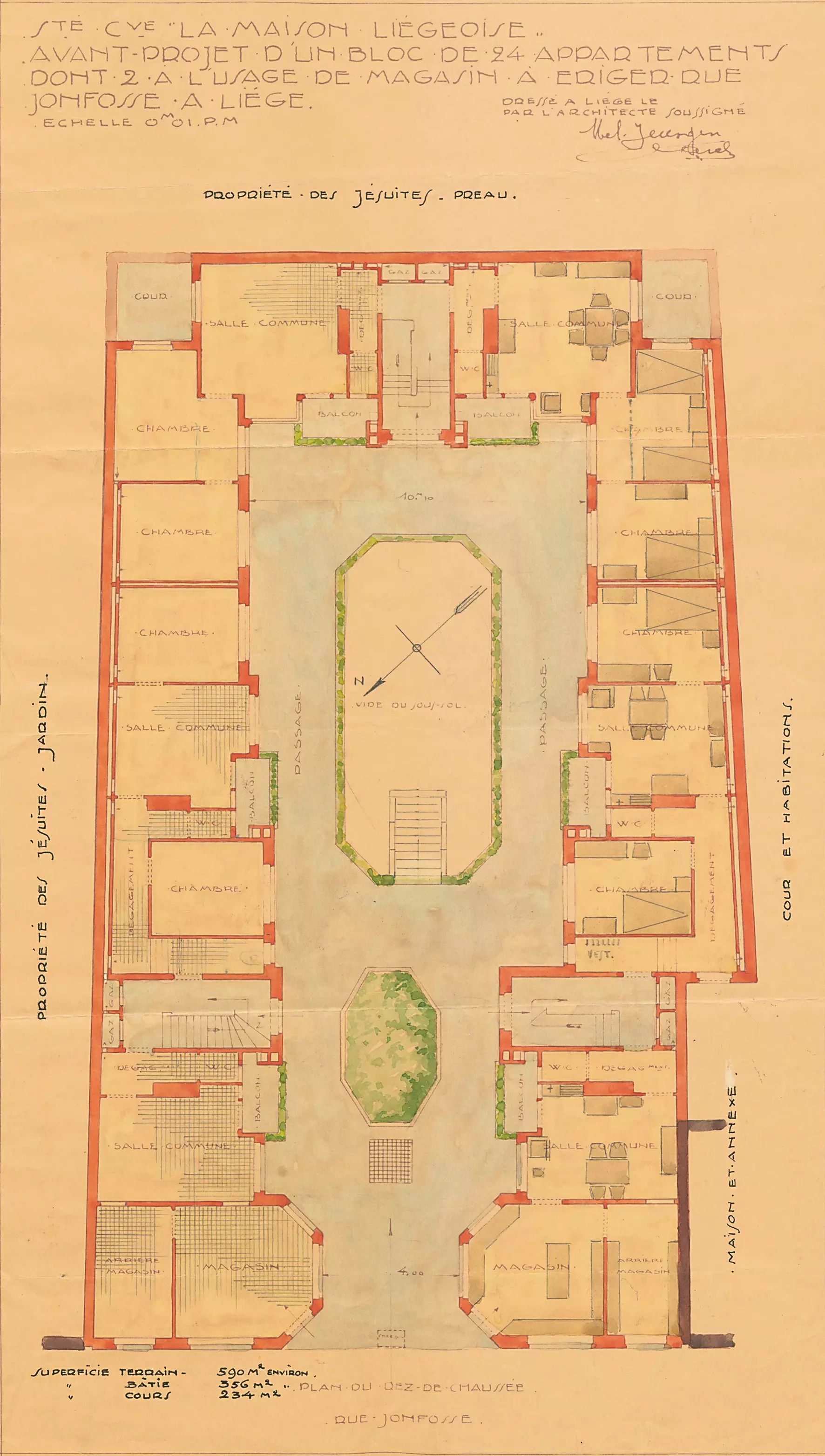 Alors que son action s'était concentrée sur la réalisation de la cité-jardin de Naniot et dans les quartiers populaires d'Amercœur (rue Saint-Remacle, 1928) et d'Outremeuse, La Maison liégeoise décide de construire un complexe de logements sociaux dans le quartier de Jonfosse. Articulés autour d'une cour centrale, trois corps de bâtiments abritent vingt-quatre appartements (1 ou 2 chambres) et deux magasins.