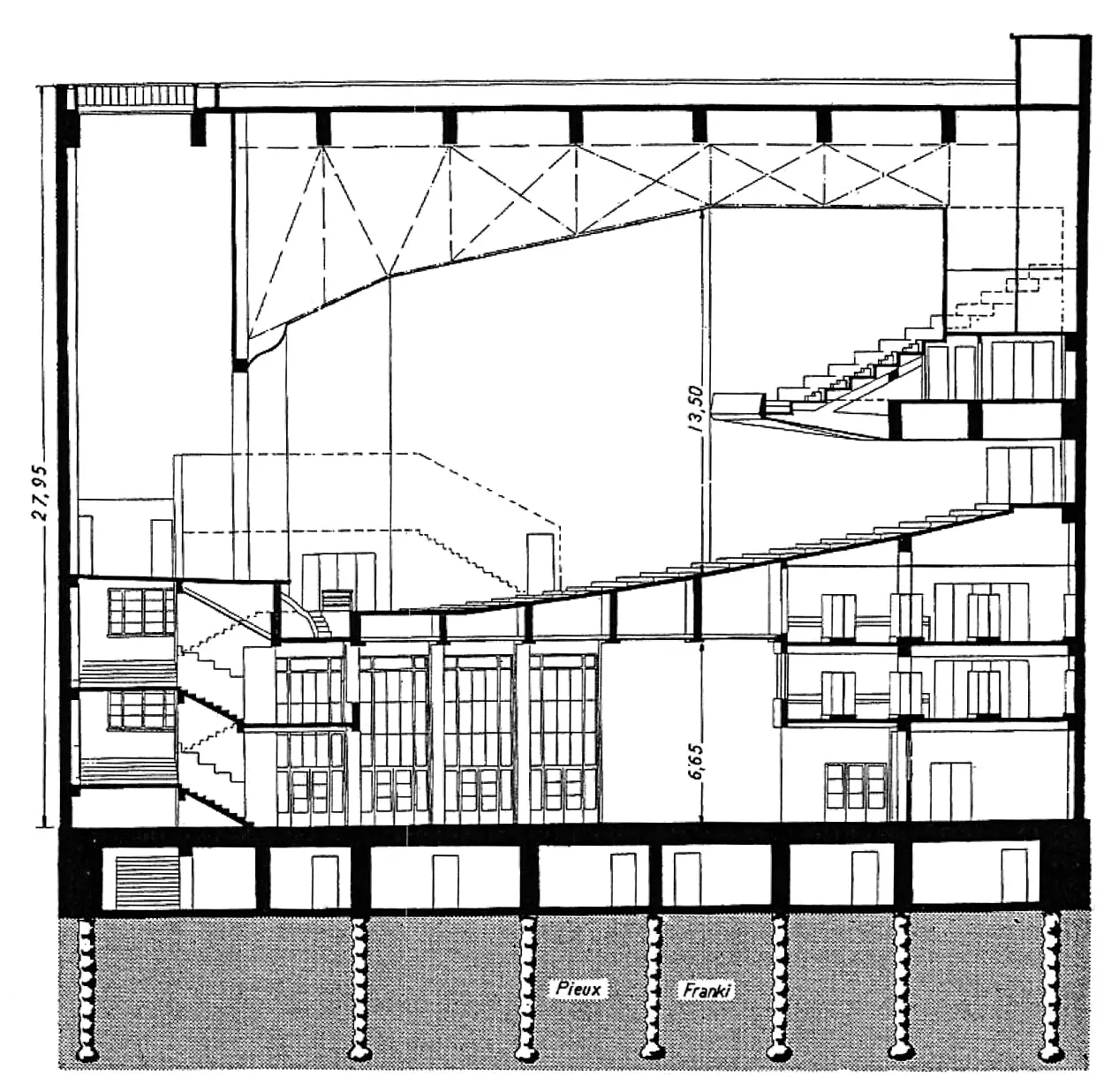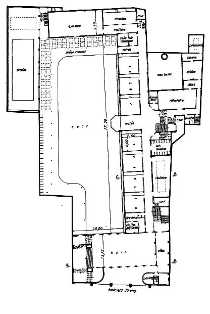 En béton armé et maçonnerie sur pieux Franki, équipée à la pointe (acoustique, air conditionné et air pulsé, ascenseurs), la construction est réalisée en un temps record, participant à la modernisation des infrastructures communales – écoles, crèche et plaines de jeux, bains publics – impulsée à la veille de l'Exposition internationale de l'eau (1939). Vers le boulevard, le bâtiment présente une façade-écran (30 x 31 m) revêtue de dalles de petit granit, animée par trois hauts-reliefs en pierre blanche (L. Dupont, A. Salle et R. Massart). Au rez-de-chaussée, le porche donne accès à un vaste hall d'entrée, surmonté au premier étage par une salle des fêtes de huit cent cinquante places, de plan trapézoïdal, ornée de fresques (A. Mambour et R. Crommelynck). Un abri antiaérien est logé au sous-sol (1 000 personnes). Derrière cette aile massive formant tampon entre le boulevard et l'école s'étend une vaste cour rectangulaire (2 400 m²). Elle est bordée, d'un côté, par une longue aile perpendiculaire de six niveaux, abritant sur les trois premiers vingt-sept classes de 7,75 sur 7,50 m, éclairées par de vastes baies munies de fines menuiseries métalliques ; au quatrième, un dortoir et nonante chambres, ceinturés d'un couloir de ronde ; au cinquième, un réfectoire, salles d'étude, de jeux et une galerie-promenade ; enfin, en toiture, le solarium.