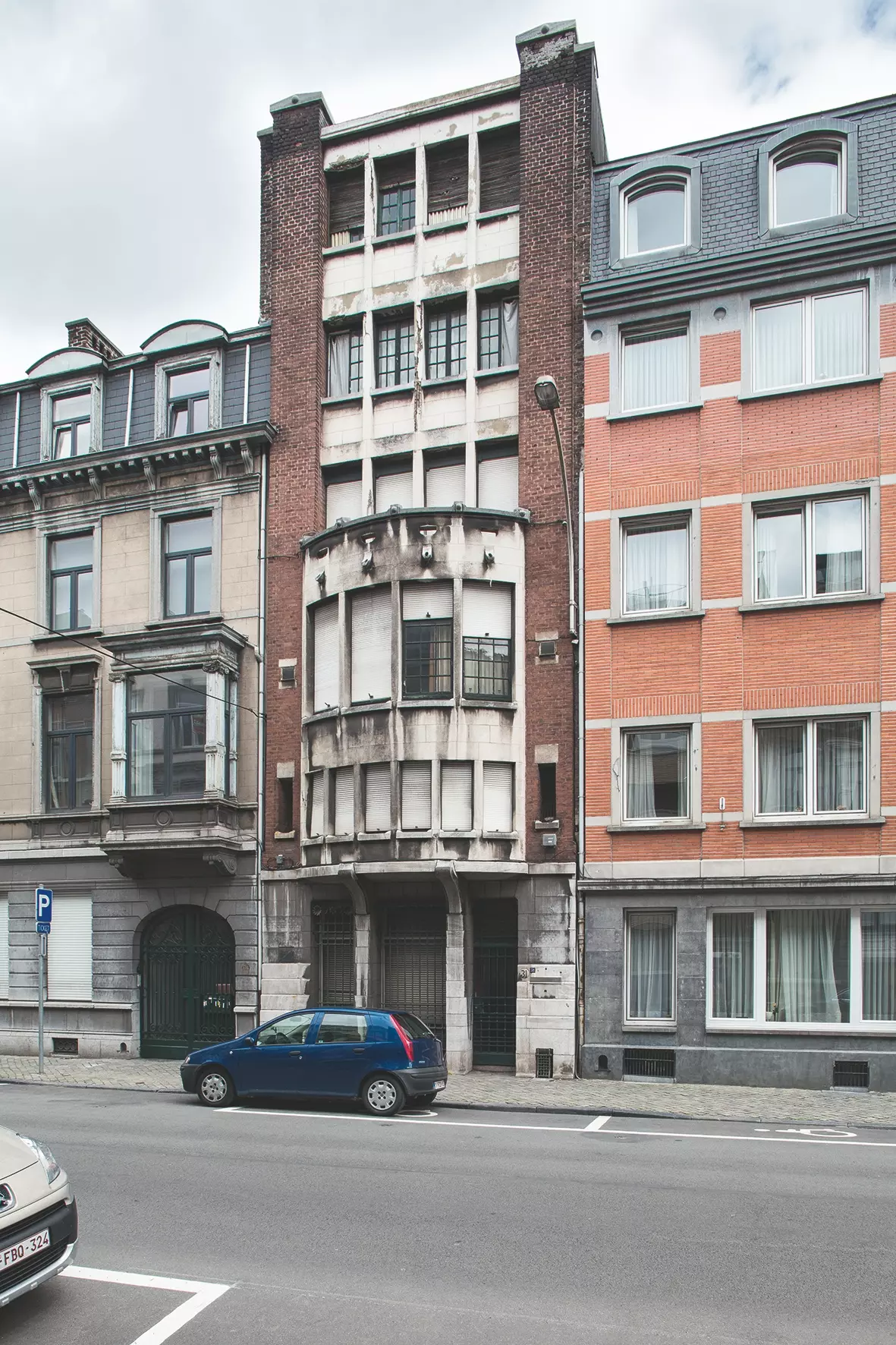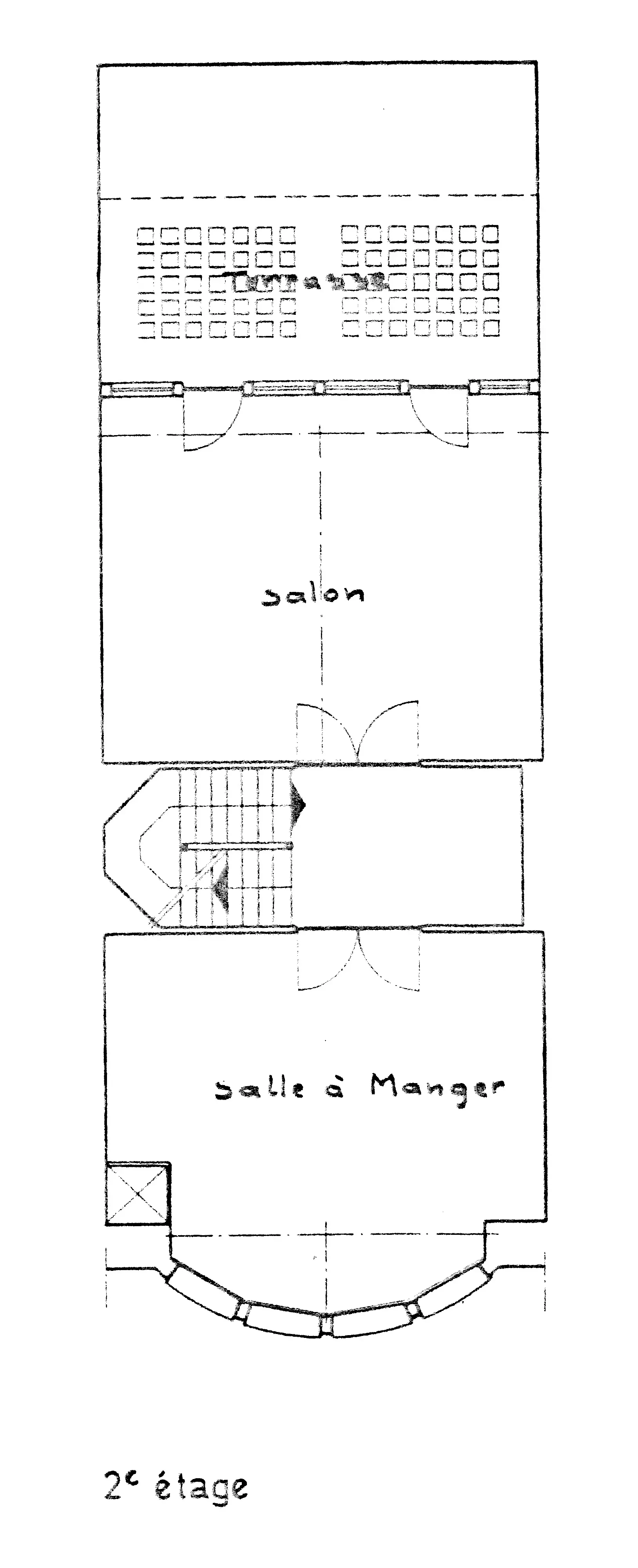 Les espaces d'habitation, dotés chacun d'un balcon arrière, sont desservis par un escalier central. Les planchers en béton libèrent l'espace, en particulier le dernier niveau. Le dessin est sobre et les finitions sont soignées : porte et grilles métalliques en façade, bow-window en béton, châssis à guillotine brevetés par l'architecte, mobilier intégré en bois, sols en mosaïque et granito.
