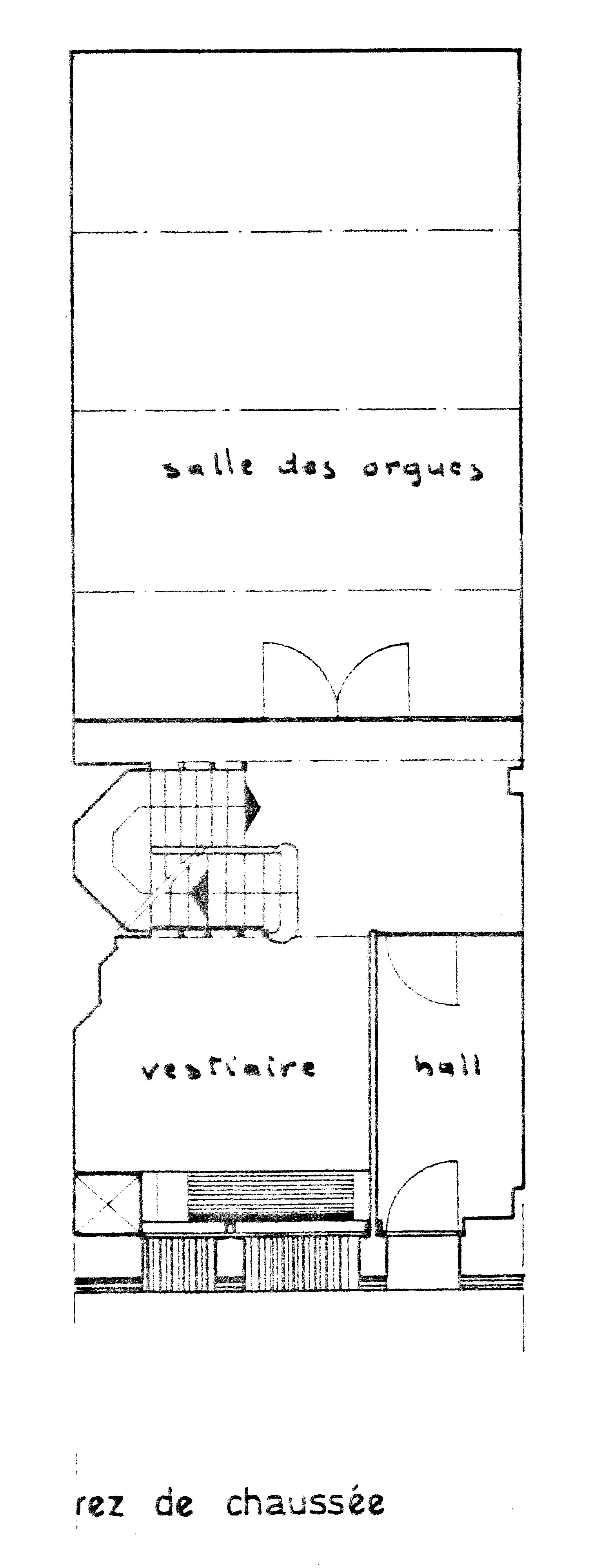 L'architecte investit avec ingéniosité l'espace au sol et entre murs mitoyens pour concrétiser un programme dense, sur six niveaux, destiné à un organiste. Le rez-de-chaussée est dévolu à son bureau, auquel succède la salle d'orgue sur la profondeur de la parcelle ; son plafond, composé de briques de verre, devient la terrasse de l'étage supérieur.