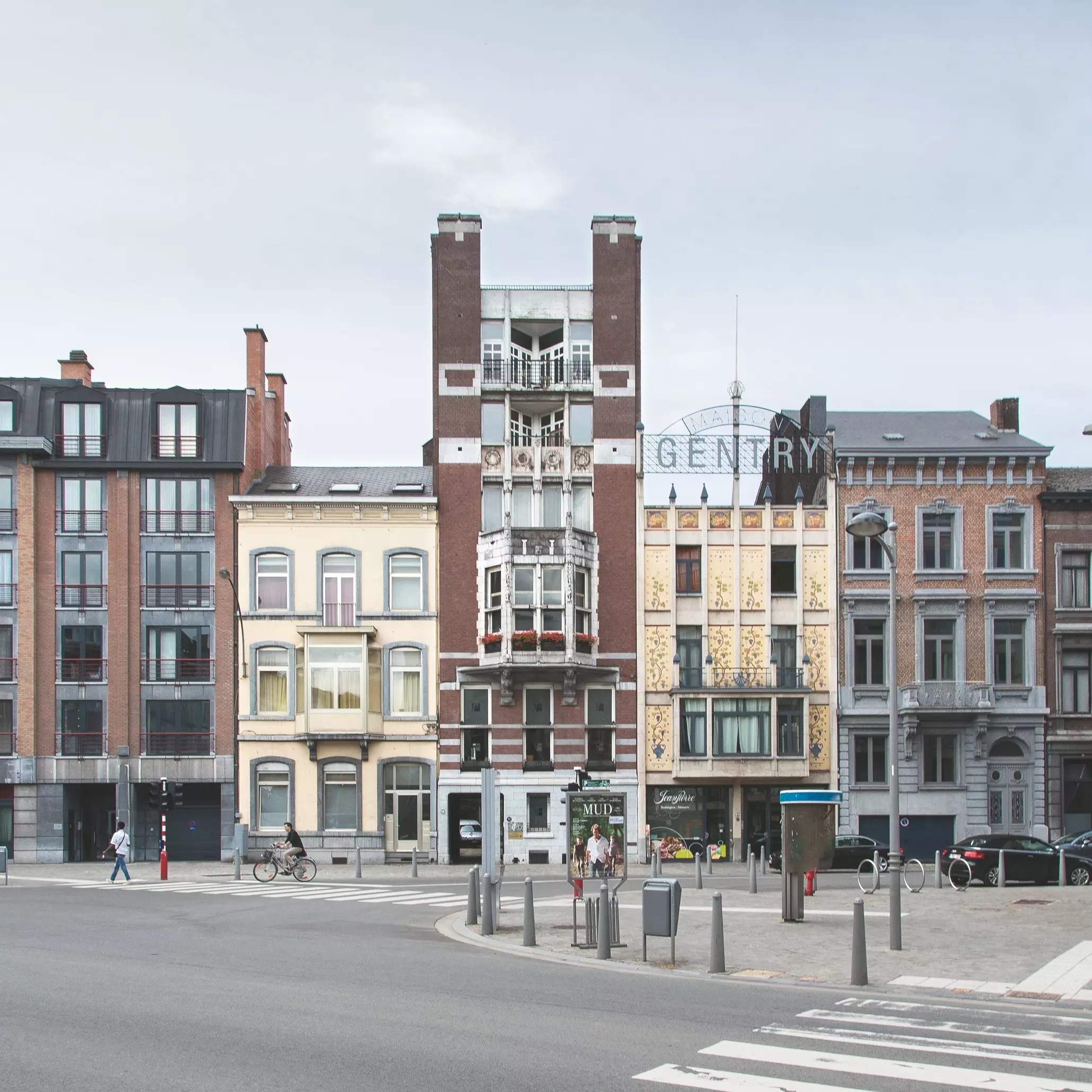 Les pilastres en façade sont couronnés par des coiffes en métal – celle du centre devenant le support sur 4 m à l'enseigne commerciale, pour, enfin, finir en mappemonde stylisée – restituées lors de la restauration par l'architecte Alain Dirix. Les sgraffites ont été restaurés par Elvira Iozzi.