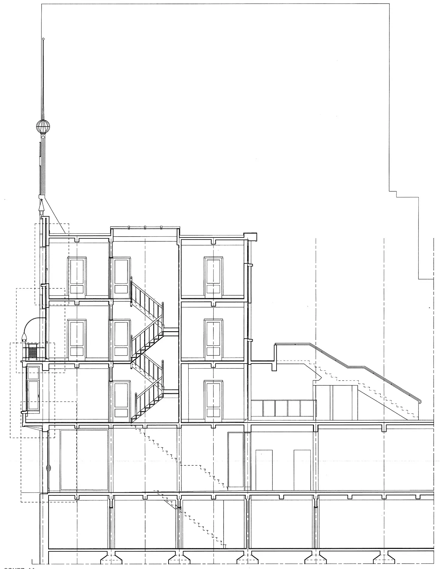 Le plan du bâtiment à rue révèle une trame structurelle très rationnelle, proche du carré (3,80 x 3,50 m), répété deux fois sur la largeur et quatre fois sur la profondeur. Rythmant rigoureusement les plafonds de chaque niveau et divisant la façade en deux travées, les poutres et colonnes à section carrée, enduites, perpétuent les expérimentations structurelles en béton que l'architecte mène d'abord à l'atelier de Paul Jaspar, puis à son propre compte, dès 1906 (Staargebouw, Maastricht, 1906-1907, démoli).