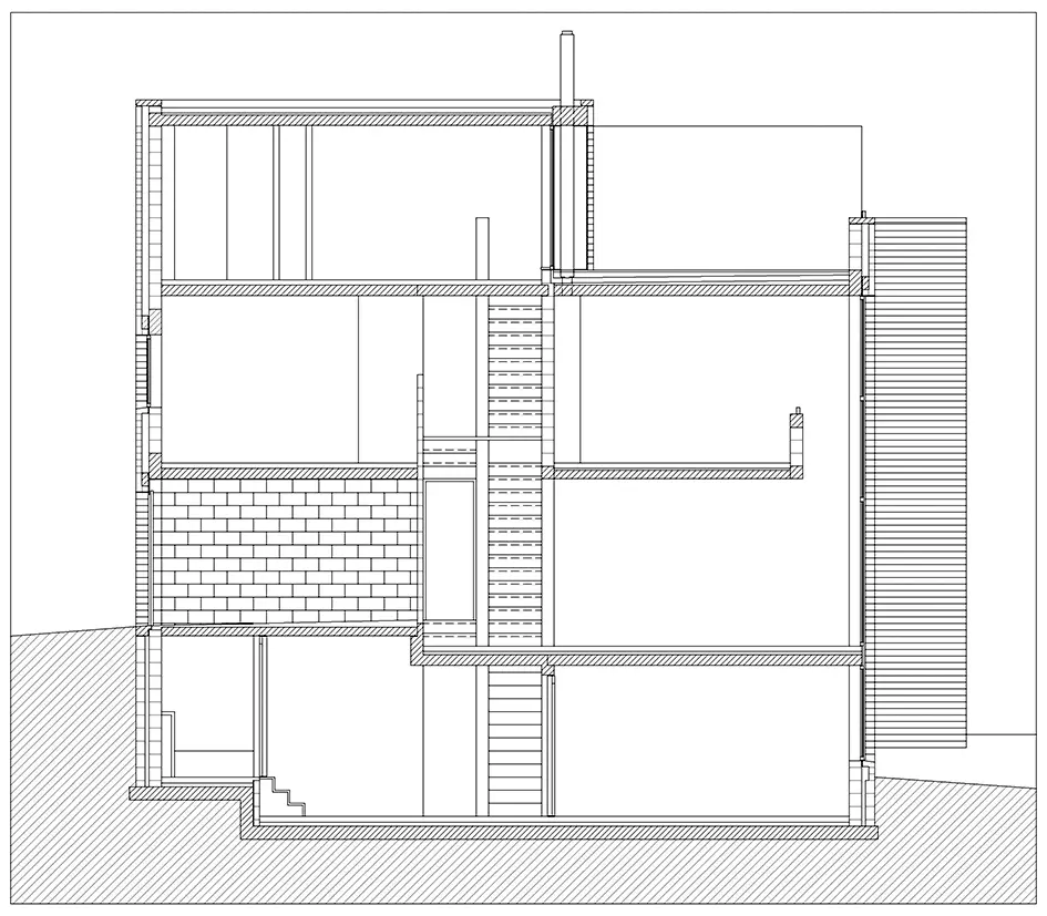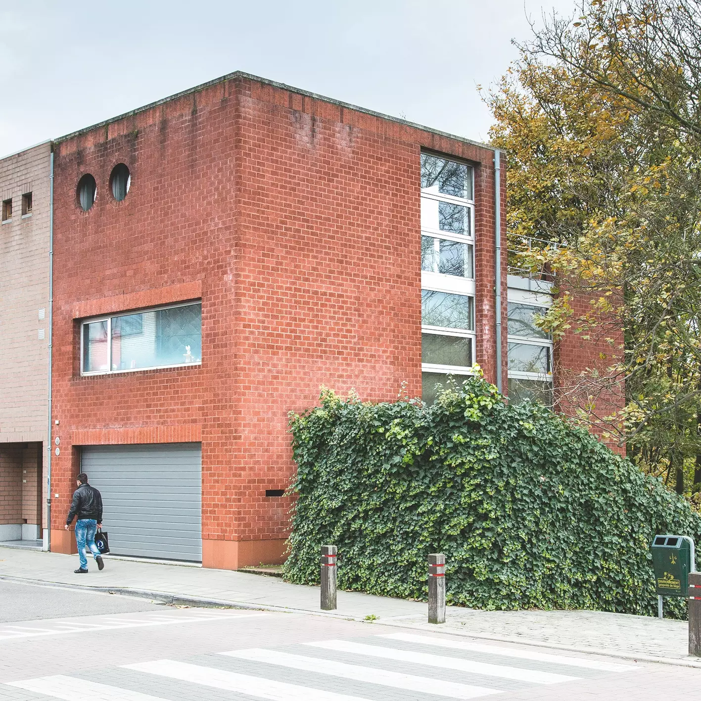 Implantée sur un terrain en forte déclivité, cette habitation – volontairement limitée à 5,70 m de façade à rue – use habilement de sa compacité et de sa position, en fin de rangée, pour s'offrir une façade latérale. L'entrée s'y positionne et ouvre sur un hall, d'où l'escalier s'élance d'un trait, perpendiculairement, et mène au salon en mezzanine.
