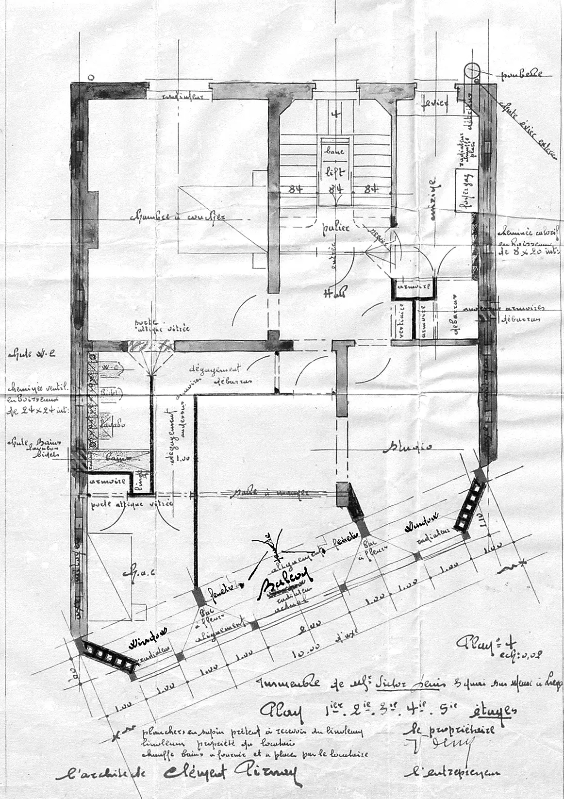 Le commanditaire, négociant en métaux et quincaillerie, profite d'une modification d'alignement du quai sur Meuse pour transformer et agrandir sa maison. Au rez-de-chaussée commercial, il souhaite ajouter des appartements destinés à la location. Probablement se montre-t-il intéressé par une réalisation similaire de l'architecte, tout juste achevée aux Degrés Saint-Pierre (démolie), et dont le programme et le traitement formel sont identiques.