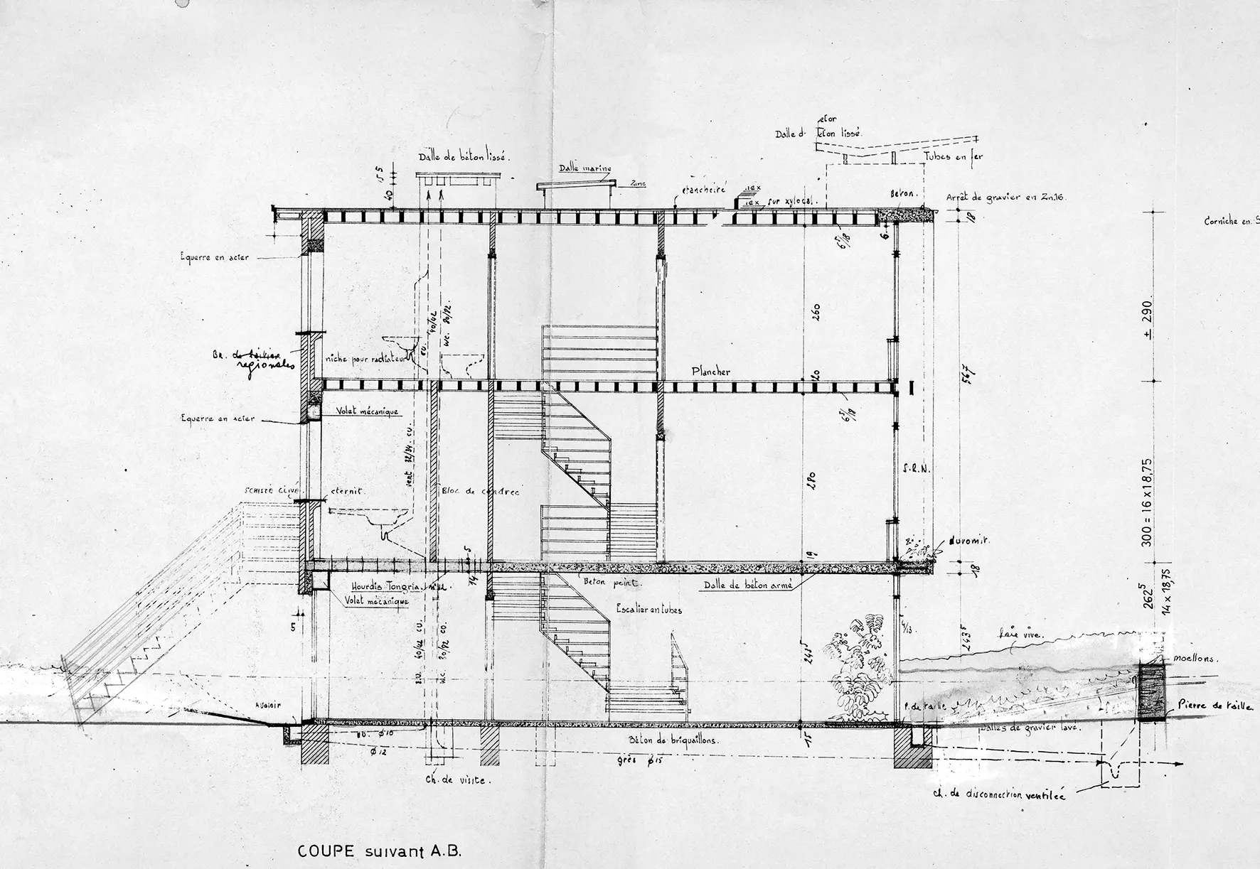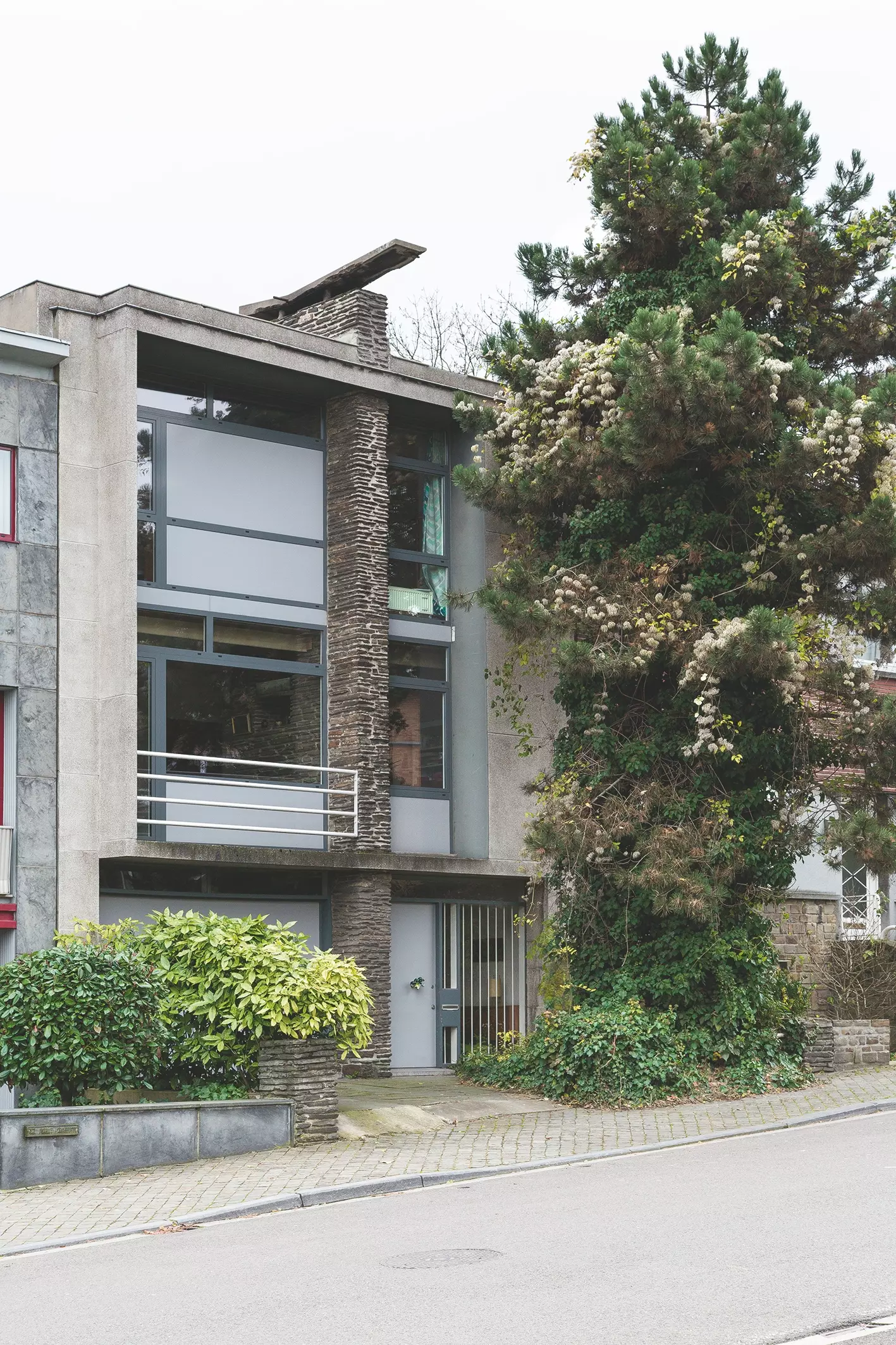 À l'intérieur de ce cadre, le jeu croisé des lignes des châssis et les rapports de pleins et de vides créés par les panneaux de remplissage relèvent d'une composition à la fois fonctionnelle et plastique. L'expression de la façade est marquée par le massif de la cheminée en schiste des carrières de la Lienne à la rugosité très affirmée, formant un axe vertical prenant assise au sol, traversant le cadre de façade et émergeant, coiffé d'une singulière couverture aérodynamique.