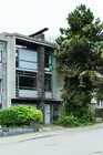 La façade est structurée par l'encadrement puissant en béton, suspendu entre les deux piédroits mitoyens, saillant et en légère oblique, englobant les deux niveaux de vie, procurant des terrasses au bel-étage et, a contrario, définissant une sorte de socle au rez-de-chaussée occupé par le garage et l'entrée.