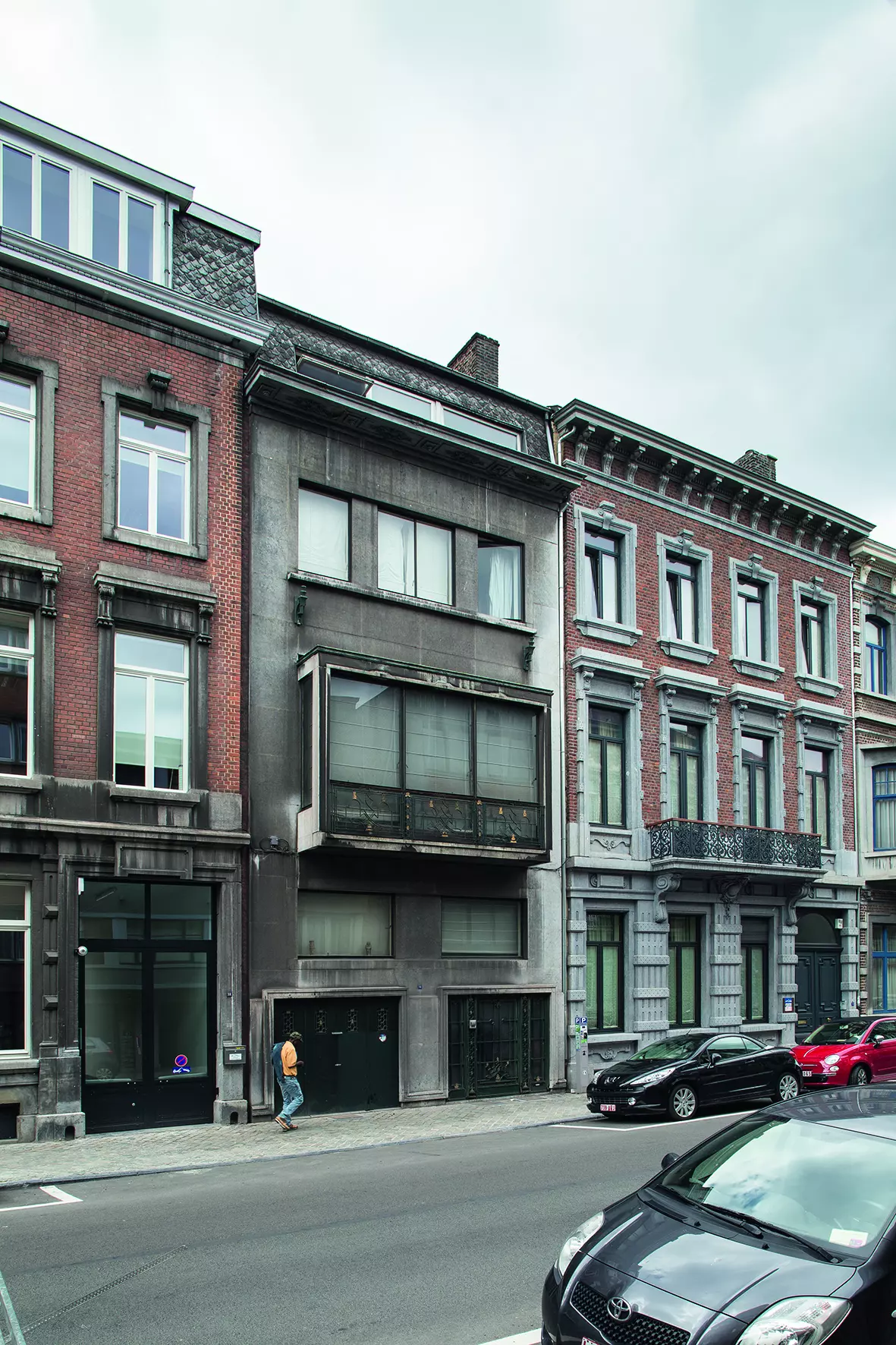 La répartition des niveaux reste d'ailleurs inchangée et correspond à celle des maisons voisines, antérieures. Le rez-de-chaussée initial a été subdivisé, afin d'aménager l'indispensable garage et, dans le nouvel entresol, un bureau. De la façade, couverte d'un parement de petit granit, seuls la corniche et l'oriel font saillie – tel un tiroir tiré du sage alignement de la rue, au bâti essentiellement néoclassique. La rigueur de son organisation, symétrique, est tempérée par la présence de ferronneries en bronze. Leur dessin revisite le style classique français du XVIIIe siècle. On retrouve les mêmes motifs sur la corniche.